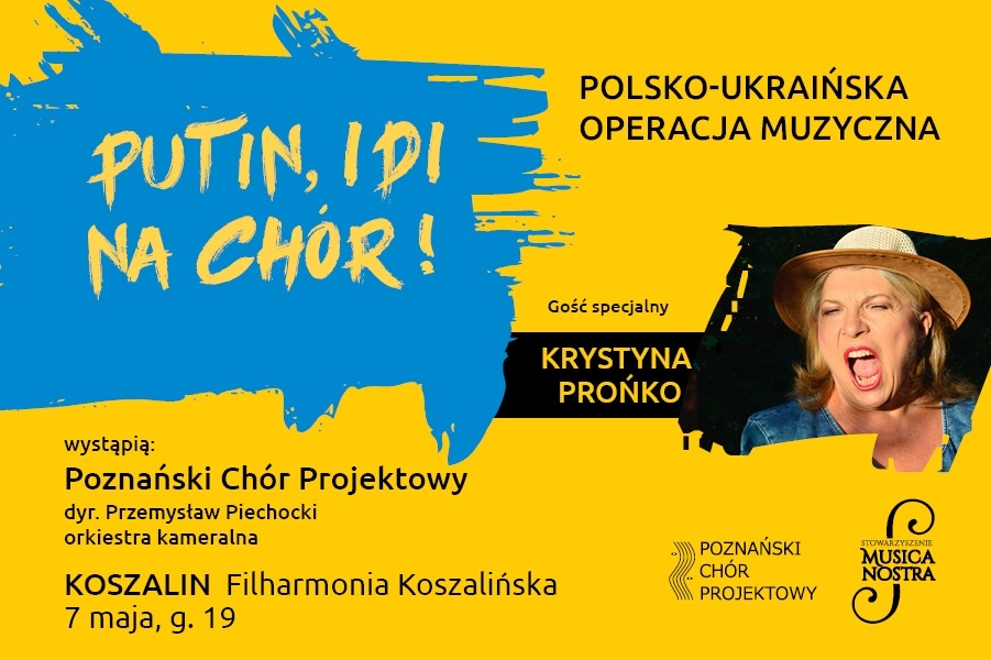 Putin, idi na chór! czyli polsko-ukraińska operacja muzyczna to koncert szczególny. Wystąpi dla Ciebie 60-osobowy profesjonalny Poznański Chór Projektowy, orkiestra kameralna, a przede wszystkim powszechnie znana i lubiana legenda polskiej estrady Krystyna Prońko. Ten imponujący aparat wykonawczy zapewni Ci wieczór pełen niezapomnianych emocji. W trakcie koncertu zabrzmią oryginalne ukraińskie utwory ludowe w aranżacji uznanego poznańskiego kompozytora Mariusza Matuszewskiego. Niebywałych wrażeń akustycznych dostarczy Ci światowej klasy nagłośnienie w technologii High End firmy Danley. Koncert poprowadzi i zadyryguje Przemysław Piechocki.