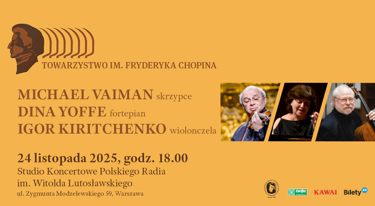 Towarzystwo im. Fryderyka Chopina zaprasza na wyjątkowy koncert światowej sławy artystów: Michaela Vaimana (skrzypce), Diny Yoffe (fortepian) i Igora Kiritchenki (wiolonczela). Zostaną wykonane utwory kameralne Fryderyka Chopina; dwa z nich: Grand Duo E-dur op. 16a i Sonata g-moll op. 65 – w adaptacji Michaela Vaimana na skrzypce i fortepian (w oryginale kompozycje te zostały napisane na wiolonczelę i fortepian). Koncert będzie niepowtarzalną okazją do wysłuchania prawykonania nowych opracowań.