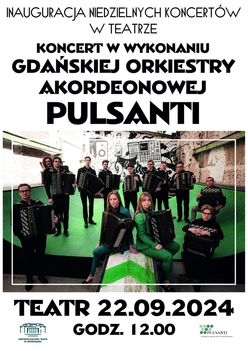 INAUGURACJA CYKLU "NIEDZIELNYCH KONCERTÓW W TEATRZE 2024/25" "Akordeonowy zawrót głowy" w wykonaniu Gdańskiej Orkiestry Akordeonowej PULSANTI Gdańska Orkiestra Akordeonowa Pulsanti to grupa akordeonistów młodego pokolenia, których drogi przecięły się w Akademii Muzycznej w Gdańsku. Muzycy to wielokrotnie nagradzani na konkursach akordeonowych instrumentaliści. Naszym celem jest popularyzowanie i ukazanie szerokiego spektrum kameralistyki akordeonowej, edukowanie od najmłodszych lat, ukazywanie akordeonu w nowatorski sposób oraz poszukiwanie oryginalnych brzmień. Jako orkiestrę wyróżnia nas podejście do samego instrumentu, jak i do muzyki, którą wykonujemy. Nie boimy się eksperymentować, na scenie pojawiają się improwizacje, a swój instrument...