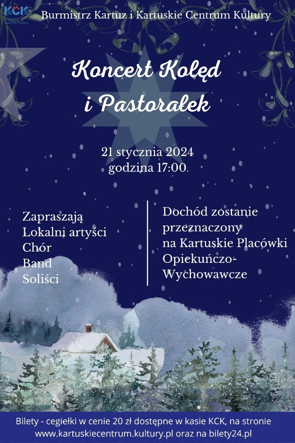 Koncert Kolęd i Pastorałek 21 stycznia 2024 godz. 17:00 Wystąpią: lokalni artyści, chór, band, soliści Bilety-cegiełki w cenie 20 zł. Dochód zostanie przeznaczony na Kartuskie Placówki Opiekuńczo-Wychowawcze *******