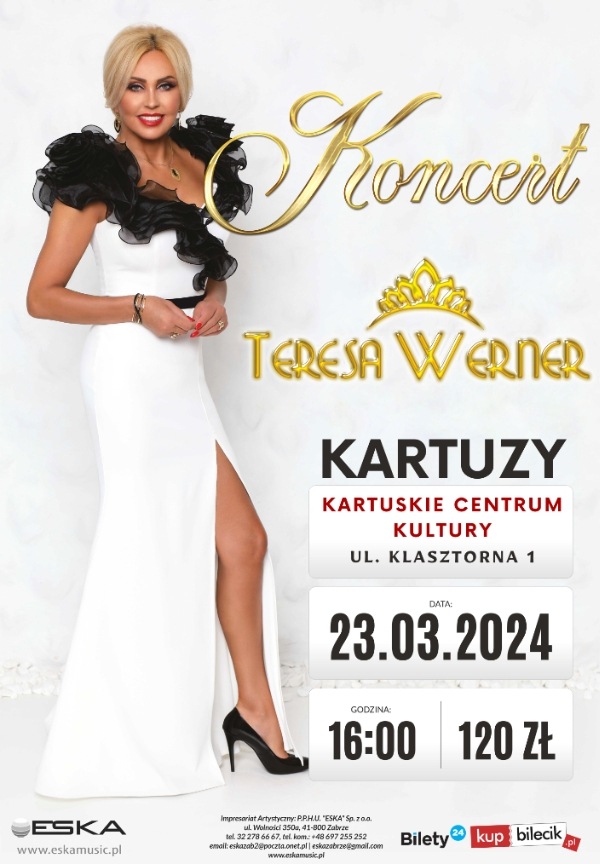 Już 23 marca wyjątkowy koncert Teresy Werner w Kartuskim Centrum Kultury. Teresa Werner to polska piosenkarka pochodząca z Nakła Śląskiego. Pojawiła się na scenach największych teatrów świata, w tym m.in. Carnegie Hall oraz Broadway. Jej występy obejmowały Europę, Afrykę, Azję oraz Amerykę Północną. W 1991 roku Teresa Werner reprezentowała zespół "Śląsk" na Festiwalu Piosenki Ludowej w RPA, gdzie zajęła pierwsze miejsce. Jej kariera solowa przyspieszyła po nagraniu takich hitów jak "Miłość jest piękna", "Dałabym Ci dała" czy "Kocham swoje morze". Jej kompozycje oraz teledyski są emitowane na antenach stacji radiowych i telewizyjnych. Dotychczas w dorobku artystki ukazało się kilka płyt CD oraz DVD. Pierwszy album "Spełnić Marzenia" uzyskał status...