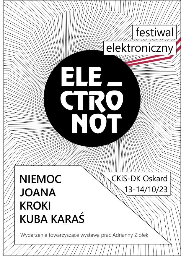 Festiwal Elektroniczny – ElectroNOT data: 13-14.10.2023 miejsce: klubokawiarnia NOT godzina: zaczynamy każdego dnia o 20: 00 karnet: 120 zł Festiwalowe lato zakończone? Nic bardziej mylnego! W dniach 13-14 października w klubokawiarni NOT w CKiS-DK Oskard (lub inaczej NOT) zagości druga już odsłona Festiwalu Elektronicznego ElectroNOT. Dwa lata temu, w ramach elektronicznego brzmienia, zagrali w naszym cyklu tacy artyści jak Zamilska, Baasch czy Bluszcz. W zeszłym roku postanowiliśmy skumulować siłę elektronicznych wykonawców i w dwa jesienne wieczory na naszej scenie zagościły takie składy jak: Skalpel, Rysy, BOKKA czy Boarding Pass. Dodatkowo festiwalowi towarzyszyła streetartowa wystawa konińskiego artysty Karola Drzewieckiego....