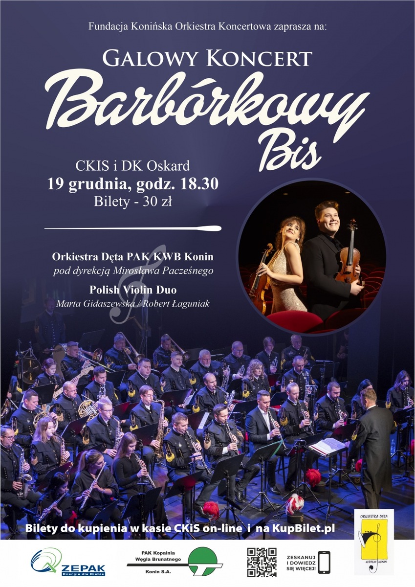 ZE PAK S.A. i PAK Kopalnia Węgla Brunatnego Konin S.A sponsorem Galowego Koncertu Barbórkowego Bis Przychód ze sprzedaży biletów zostanie w całości przeznaczony na realizację celów statutowych Fundacja "Konińska Orkiestra Koncertowa" Z końcem 2022 roku z inicjatywy Mirosław Pacześny i Joanna Gajdzińska została powołana fundacja „Konińska Orkiestra Koncertowa”, której misją jest zachowanie tradycji i dokonań Orkiestra Dęta PAK KWB Konin oraz poszukiwanie nowych kierunków jej rozwoju. Chcąc zaprezentować swoje umiejętności szerszej publiczności, fundacja przy wsparciu ZE PAK S.A. i KWB Konin S.A. organizuje Galowy Koncert Barbórkowy Bis, z gościnnym udziałem światowej sławy duetu skrzypcowego Polish Violin Duo. Bilety w cenie 30,00 zł będą...