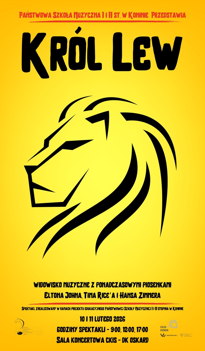 Państwowa Szkoła Muzyczna I i II st. w Koninie zaprasza na spektakl „Król Lew”– niezwykłe widowisko muzyczne, które porusza serca widzów na całym świecie! Podczas spektaklu będzie można usłyszeć kultowe utwory Eltona Johna i Hansa Zimmera, takie jak „Krąg życia”, „Miłość rośnie wokół nas” czy „Hakuna Matata”. Zanurz się w emocjonującą opowieść o odwadze, przeznaczeniu i sile miłości. Przeżyj niezapomnianą podróż przez afrykańską sawannę, gdzie magia teatru ożywia jedną z najbardziej wzruszających historii wszech czasów.*******