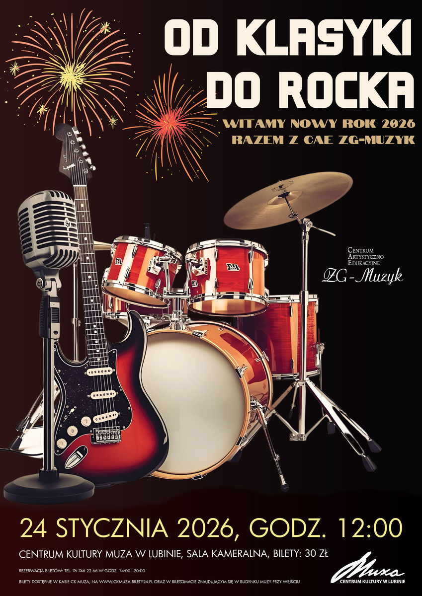 Młodzi artyści CAE ZG-Muzyk po raz kolejny zapraszają na muzyczną wędrówkę przez style - od klasycznych brzmień, poprzez pop i jazzowe inspiracje, po rockowe akcenty. Usłyszymy wokal, perkusję i gitary w wielu odsłonach, prezentowane przez pełnych pasji adeptów muzyki. Czas trwania: ok. 90 minut Bilety do nabycia w kasie MUZY, biletomacie oraz w sprzedaży internetowej na www.muza.bilety24.pl*******