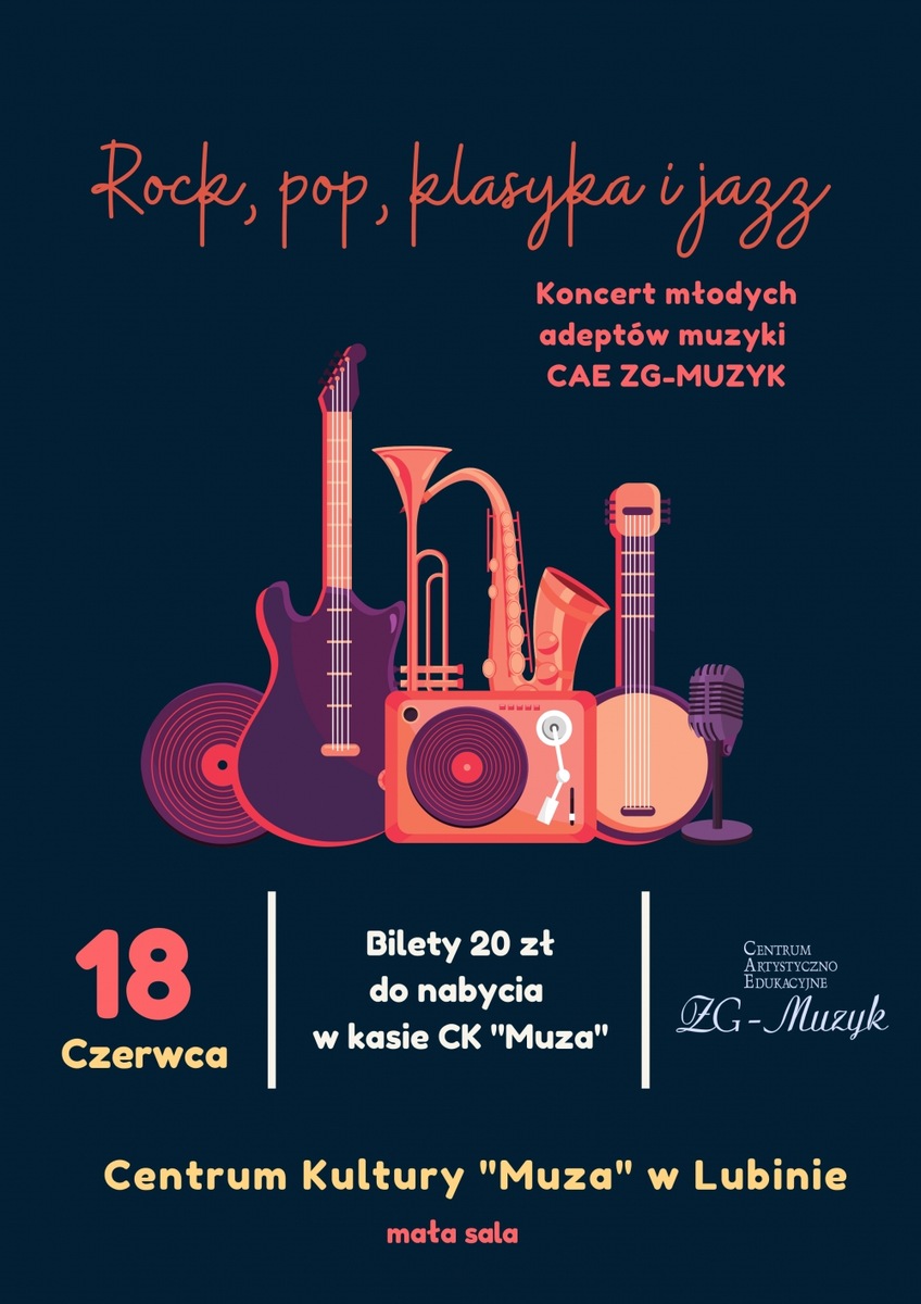 Czas podsumowań muzycznych kolejnego roku szkolnego CAE „ZG-MUZYK” – najprzyjemniejsze chwile – koncertowanie! W różnorodnych klimatach i stylach zabrzmią: gitary elektryczne, wokal, fortepian, flet i skrzypce.