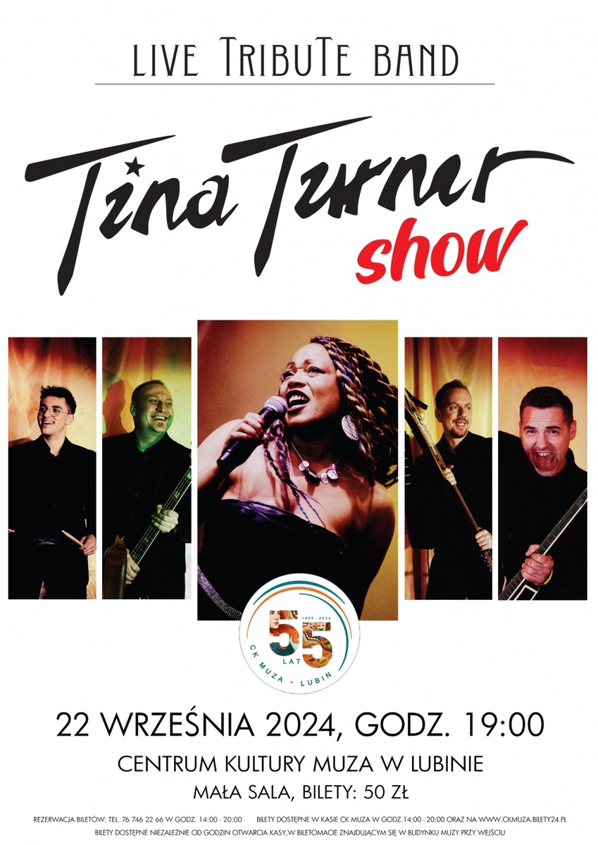 Tina Turner Show” to wierna kopia oryginału. Każdy szczegół jest tutaj dopracowany pod względem muzycznym jak i wyglądu. Głos naszej Tiny (Adeama) jest silny i mocny, a sposób śpiewania jest łudząco podobny do oryginału! Muzyka w całości jest na żywo, a na koncercie można poczuć klimat rockowo-soulowy w najlepszym wydaniu i oryginalnych aranżacjach Tiny Turner. Zespół ma bardzo dobry kontakt z publicznością! Tina Turner Show to największe przeboje z lat 80-tych i 90-tych KRÓLOWEJ ROCKA! Skład zespołu: Adeama Walkowiak - wokal Piotr Zych - bas Miłosz Machnicki - perkusja Marcin Gołda - gitara Gracjan Machnicki - gitara Bilety do nabycia w kasie MUZY, w biletomacie oraz w sprzedaży internetowej na www.ckmuza.bilety24.pl*******