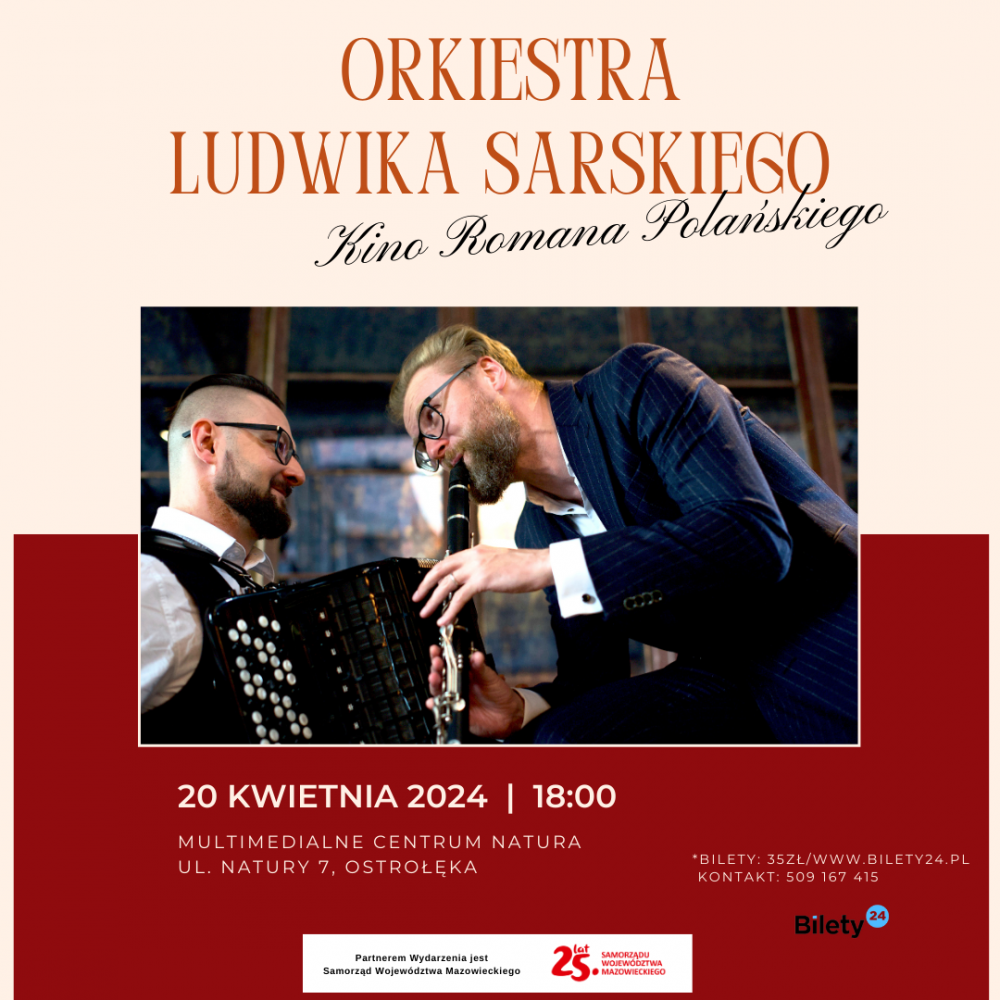 Zapraszamy Państwa na muzyczną ucztę połączoną w wyjątkowy sposób z kinematografią, na scenie wystąpi ORKIESTRA LUDWIKA SARSKIEGO z kinem Romana Polańskiego, 20 kwietnia 2024 o godz. 18:00 w Multimedialnym Centrum Natura, Ostrołęka, ul. Natury 7. Partnerem Wydarzenia jest Samorząd Województwa Mazowieckiego. Mazowsze serce Polski ORKIESTRA LUDWIKA SARSKIEGO Kolektyw artystyczny założony przez multiinstrumentalistów – kompozytorów: Damiana Szymczaka oraz Piotra Tomalę. Artyści łączą takie style jak early jazz, ragtime, tango, swing, czy klezmer. Zespół z dużym powodzeniem koncertuje w Polsce i za granicą. Działalność́ Orkiestry Ludwika Sarskiego to kameralne koncerty oraz wykonywanie autorskiej muzyki na żywo do filmów niemych Bustera Keatona,...