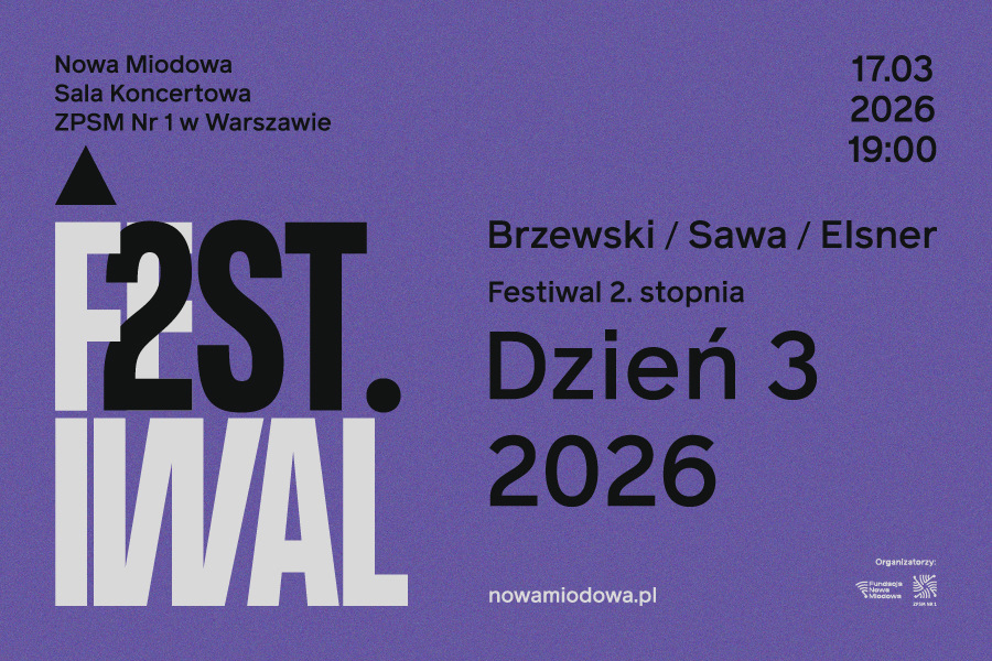 Święto SZKÓŁ II stopnia! Podczas trzech marcowych spotkań pokażemy siłę i moc muzyki płynącą prosto z trzech niezwykłych szkół Zespołu Państwowych Szkół Muzycznych Nr 1 w Warszawie i ich wyjątkowych tożsamości! B jak Brzewski, S jak Sawa, E jak Elsner. W marcowe wtorkowe wieczory, będziemy prezentować najlepsze artystyczne oblicza uczniów tych szkół. Trzy tradycje, trzy światy, trzy koncerty, dziesiątki wspaniałych młodych twórców, miłość do muzyki i bycia razem. Ideą festiwalu jest promocja uczniów OSM II st. im. Z. Brzewskiego, OSM II st. im. M. Sawy i PSM II st. im. J. Elsnera. Program: Informacje wkrótce Wykonawcy: Informacje wkrótce Organizator: Fundacja Nowa Miodowa i ZPSM Nr 1 w Warszawie*******
