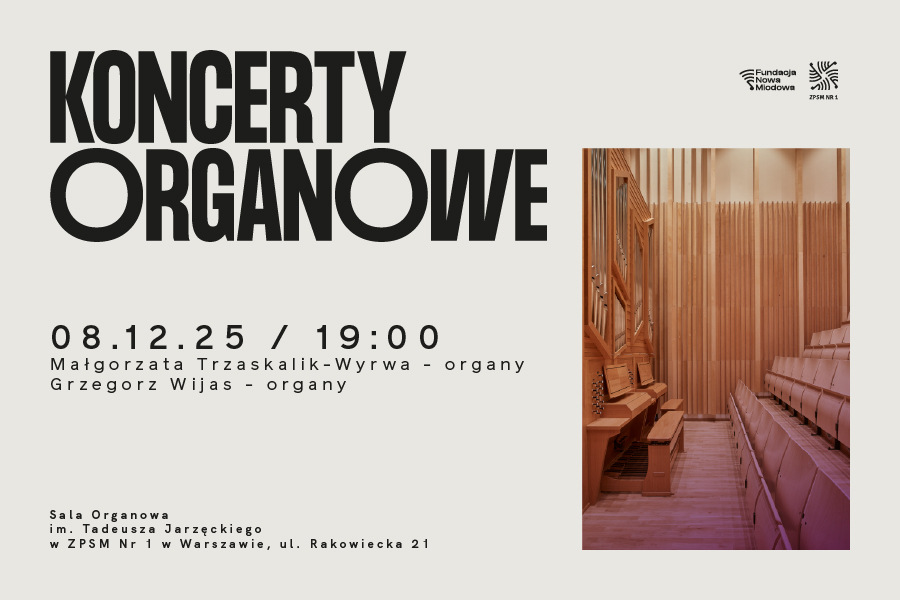 Koncert w ramach cyklu koncertów organowych w Sali Organowej im. T. Jarzęckiego w ZPSM Nr 1. Program: Opowieść o organach – koncert edukacyjny. Improwizacje organowe. Wykonawcy: Małgorzata Trzaskalik-Wyrwa organy Grzegorz Wijas organy Organizator: Fundacja Nowa Miodowa i ZPSM Nr 1 w Warszawie*******