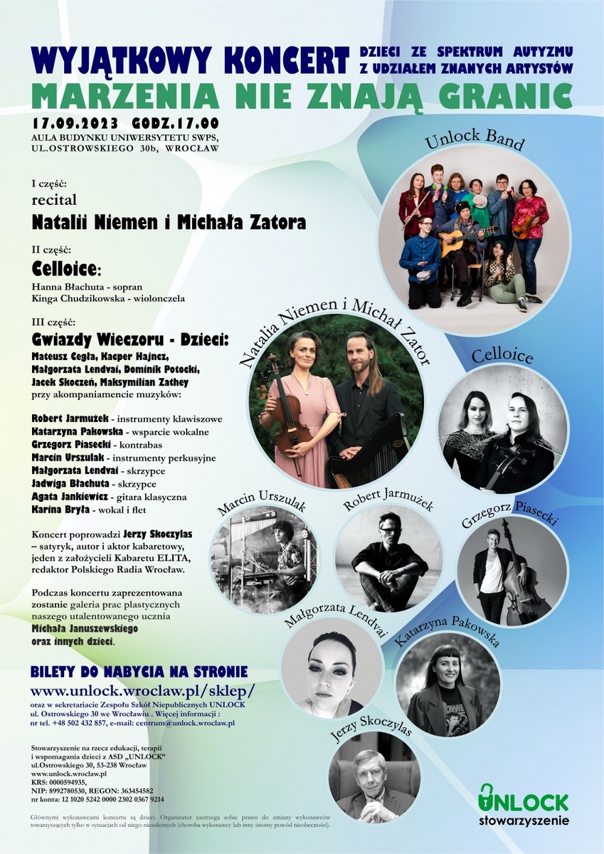 Zapraszamy na wyjątkowy koncert dzieci ze spektrum autyzmu z udziałem znanych artystów “Marzenia nie znają granic”, który odbędzie się 17.09.2023 o godz. 17.00 w auli budynku UNIWERSYTETU SWPS, ul.Ostrowskiego 30b, we Wrocławiu. I część: recital Natalii Niemen i Michała Zatora II część: Celloice: Hanna Błachuta – sopran Kinga Chudzikowska – wiolonczela III część: Gwiazdy Wieczoru – Dzieci: Mateusz Cegła, Kacper Hajncz, Małgorzata Lendvai, Dominik Potocki, Jacek Skoczeń, Maksymilian Zathey przy akompaniamencie muzyków: Robert Jarmużek – instrumenty klawiszowe Katarzyna Pakowska – wsparcie wokalne Grzegorz Piasecki – kontrabas Marcin Urszulak – instrumenty perkusyjne Małgorzata Lendvai – skrzypce Jadwiga Błachuta – skrzypce Agata Jankiewicz –...