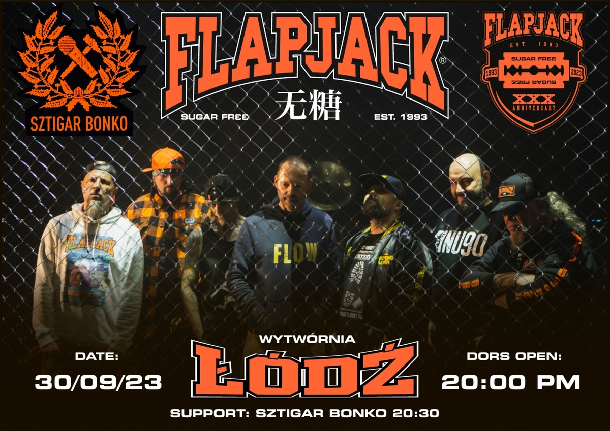 30 lat po pierwszych zagranych dźwiękach zespół Flapjack powraca na scenę z nowym, piątym studyjnym materiałem i rusza w trasę promującą najnowszy album SUGAR FREE. Dotychczasowe albumy: Ruthless Kick; Fairplay czy Juice Planet Earth stały się jednym z symboli szeroko pojętej polskiej muzyki rockowej lat 90. Przyczynkiem do spotkania po latach była niespodziewana śmierć wokalisty zespołu – Grzegorza „Guzika” Guzińskiego. Koncerty pod hasłem Tribute to Guzik wskrzesiły rockowego ducha dawnych lat, a zespół postanowił przy okazji prób zarejestrować kilka utworów, które ostatecznie przerodziły się w nowy album „Sugar Free”, którego premiera będzie 13 września 2023 roku. Płyta będąca eklektycznym połączeniem muzyki metalowej, rap i hard core jest na naszej scenie muzycznej czymś ożywczym a koncerty przenoszą w czasy, gdy w klubach stage diving był czymś naturalnym. Obecnie w skład zespołu wchodzą: Robert „Litza” Friedrich (Luxtorpeda); Maciej „Ślimak” Starosta (Acid Drinkers); Maciej Jahnz (Orgasmatron); Rafał „Hau” Mirocha (Dynamind); Michał „MIHAU” Kaleciński. W miejsce zmarłego Guzika dołączył Jakub „Kroto” Krotofil (Hope) a kolorytu całości dodaje Michał Baj znany szerzej jako DJ Eprom.