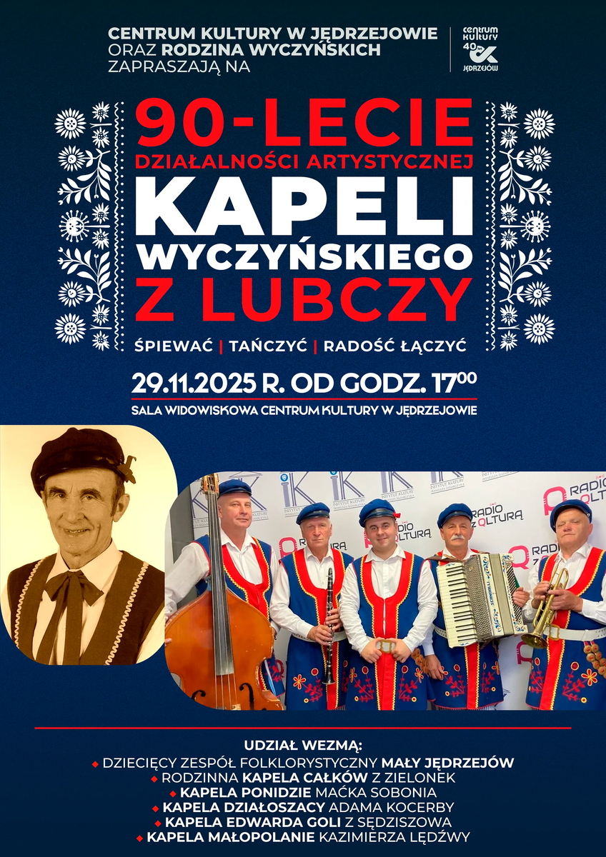 Zapraszamy serdecznie na Jubileusz 90-lecia działalności artystycznej Kapeli Wyczyńskiego z Lubczy. Będzie on miał miejsce w sali widowiskowej Centrum Kultury w Jędrzejowie w sobotę, 29 listopada 2025 r. o godz. 17:00. Kapela Wyczyńskiego została założona w 1935 roku przez Feliksa Wyczyńskiego – pasjonata i propagatora muzyki ludowej. Z biegiem lat Kapela prowadzona była przez jego brata, śp. Stefana Wyczyńskiego, wybitnego twórcę ludowego, znanego i cenionego nie tylko w regionie świętokrzyskim, ale i w całej Polsce. To właśnie dzięki jego ogromnej pracy, talentowi i zaangażowaniu Kapela Wyczyńskiego zyskała niepowtarzalny charakter, stając się ambasadorem kultury tradycyjnej i muzyki ludowej regionu. Obecnie dzieło to kontynuuje Jacek Wyczyński...