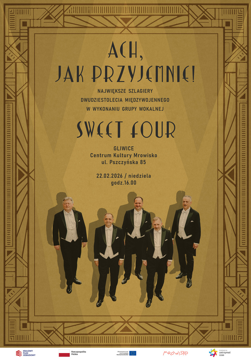 To wieczór pełen elegancji, wzruszeń i muzycznych wspomnień, które na długo pozostaną z nami Zespół Sweet Four zachwyci publiczność doskonałymi harmoniami wokalnymi i niezwykłym klimatem przedwojennych piosenek. Utwory takie jak „Już nie zapomnisz mnie”, „Całuję Twoją dłoń madame”, „Umówiłem się z nią na dziewiątą” czy „Powróćmy jak za dawnych lat”******* Bezpieczne zakupy w Bilety24. W przypadku odwołania wydarzenia, gwarantujemy automatyczny zwrot środków potwierdzony komunikatem wysyłanym na adres e-mail, podany podczas zakupu.