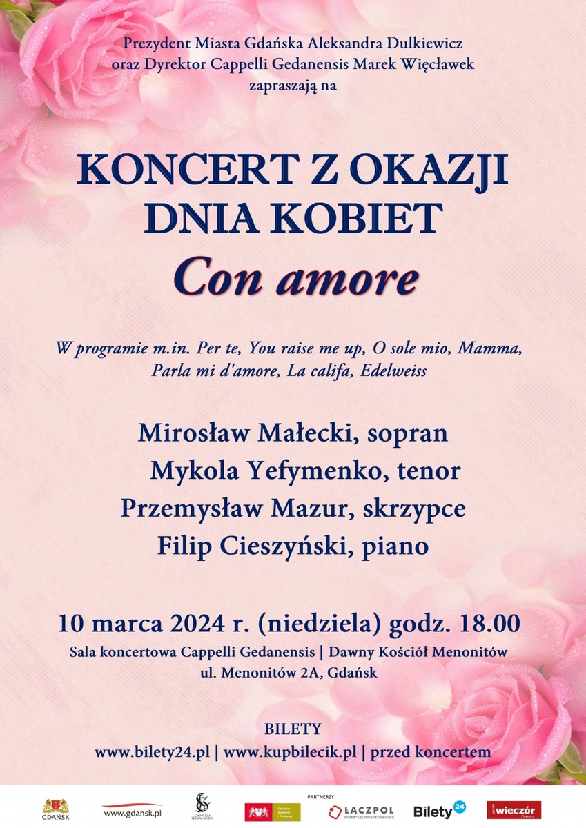 Cappella Gedanensis zaprasza na KONCERT Z OKAZJI DNIA KOBIET Con amore W programie m.in. Per te, You raise me up, O sole mio, Mamma, Parla mi d'amore, La califa, Edelweiss Wystąpią znakomici soliści Mirosław Małecki, sopran Mykola Yefymenko, tenor Przemysław Mazur, skrzypce Filip Cieszyński, piano 10.03.2024 (niedziela), godz. 18:00 Sala koncertowa Cappelli Gedanensis Dawny Kościół Menonitów, ul. Menonitów 2a*******