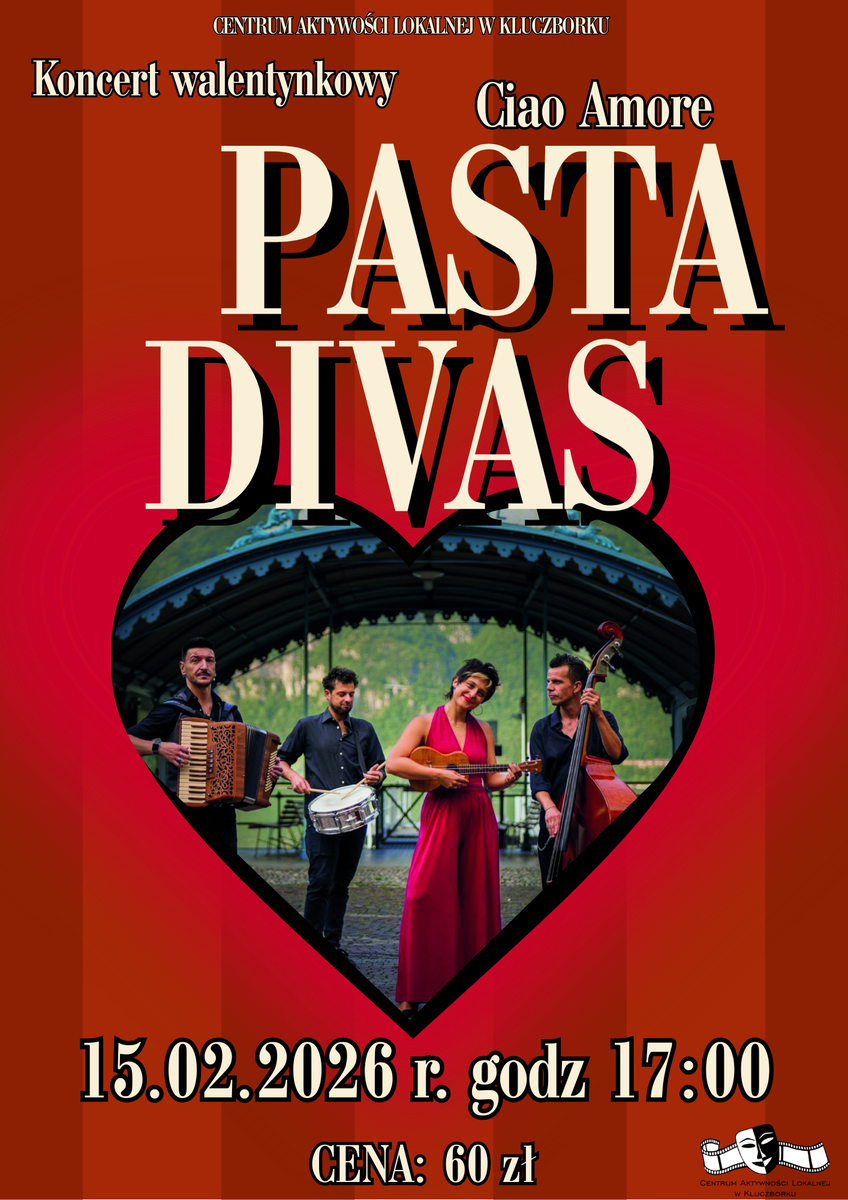 Koncert walentynkowy "Ciao Amore" to prawdziwa gala muzyczna, podczas której elegancja spotka się z włoską pasją. Pasta Divas to czteroosobowy zespół złożony z utalentowanych muzyków, którzy potrafią oczarować publiczność od pierwszej minuty. Program koncertu obejmuje największe włoskie przeboje o miłości - od romantycznych ballad po energetyczne hity, które zna cały świat. Całość wzbogacona będzie premierą autorskiej kompozycji zespołu, przygotowanej specjalnie na Walentynki 2026. To wydarzenie nie tylko muzyczne, ale i artystyczne - z piękną emocją, światłem i włoską estetyką. Każdy koncert Pasta Divas to gwarancja wysokiego poziomu, perfekcyjnej oprawy i wyjątkowej atmosfery. Już po raz drugi kluczborska publiczność zostanie zaproszona do wspólnej podróży w świat włoskiej kultury, smaków i emocji. " Ciao Amore " to propozycja dla tych, którzy szukają niezapomnianych przeżyć i chcą spędzić Walentynki w naprawdę wyjątkowy sposób. Zespół, dawniej występujący pod nazwą Banda Boffelli, od lat jest ceniony w Polsce. Wcześniejsze trasy koncertowe spotkały się z niezwykle żywą i ciepłą reakcją publiczności, a piąta przyniosła nowe, wspaniałe doświadczenia artystyczne. Teraz Pasta Divas przyjeżdża do Polski po raz szósty, z nowym projektem i świeżą energią. Jak zawsze, ich koncerty są pełne emocji, włoskiego temperamentu i kontaktu z publicznością - każda trasa kończy się sukcesem, gromkimi brawami i szczerym entuzjazmem widzów. Zespół koncertował już w wielu miejscach Europy - od Barbera Italiana w Mediolanie, przez Festiwal Win w Pitigliano, Mercado Italiano we Francji, aż po arabską Teterię Almeria. Teraz ponownie odwiedzi Polskę, by podzielić się muzyką, radością i pasją - w rytmie prawdziwego włoskiego amore.