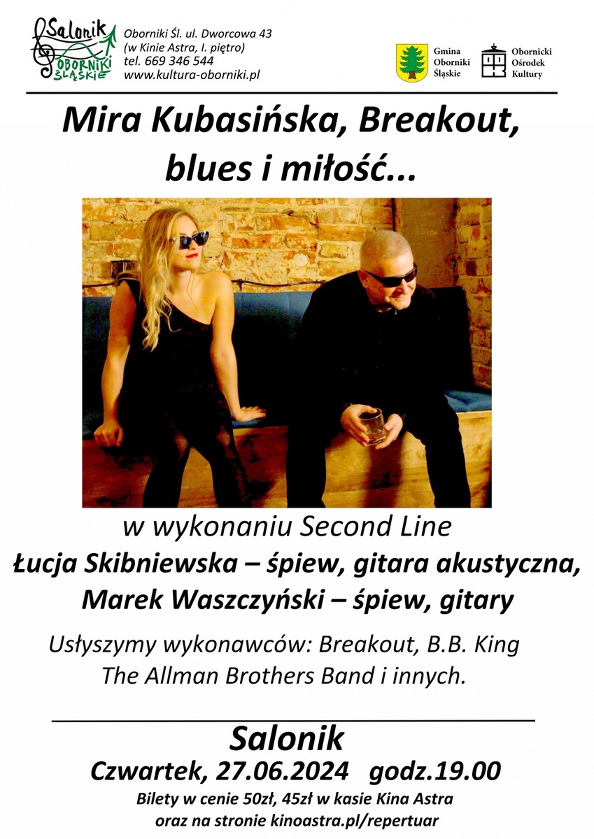 Koncert Zespółu Second Line: Łucja Skibniewska-śpiew, gitara akustyczna Marek Waszczyński-śpiew, gitary W czasie koncertu usłyszymy niezapomniane utwory Breakout, B. B. King, The Allman Brothers Band i wielu innych.*******
