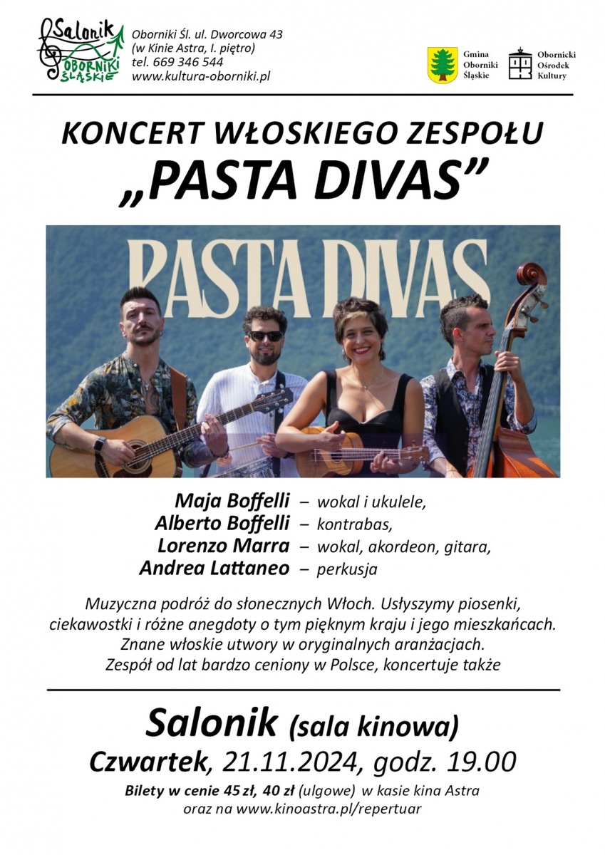 To wszystko podczas koncertu prawdziwie włoskiego zespołu ,,Pasta Divas", który zaprezentuje włoskie utwory we własnych oryginalnych aranżacjach. Zespół, dawniej występujący pod nazwą Banda Boffelli, od lat jest ceniony w Polsce. Cztery trasy koncertowe spotkały się z niezwykle żywą i ciepłą reakcją publiczności.