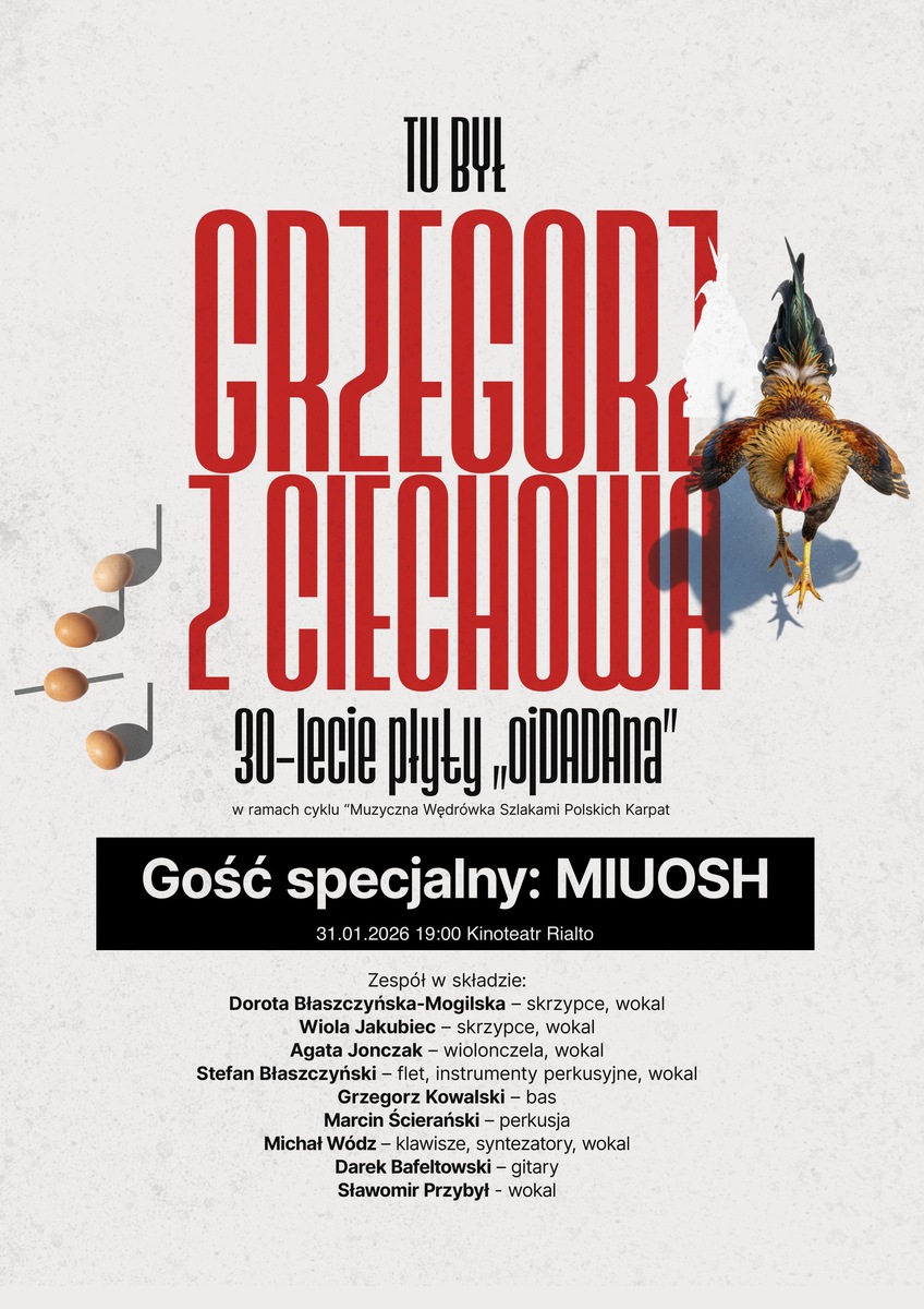 „Tu był Grzegorz z Ciechowa” - 30-lecie albumu „ojDADAna” to wyjątkowy projekt muzyczny upamiętniający 30-lecie kultowego albumu Grzegorza Ciechowskiego. Aranżacje przygotowane przez Grzegorza Kowalskiego i Dorotę Mogilską-Błaszczyńską łączą tradycyjne motywy ludowe z nowoczesnym brzmieniem elektroniki i muzyki rozrywkowe. Gościnnie wraz z zespołem wystąpi jeden z najważniejszych polskich raperów i producentów muzycznych MIUOSH. Projekt jest hołdem dla twórczości Grzegorza Ciechowskiego i próbą ponownego odczytania jego idei łączenia tradycji z nowoczesnością.
