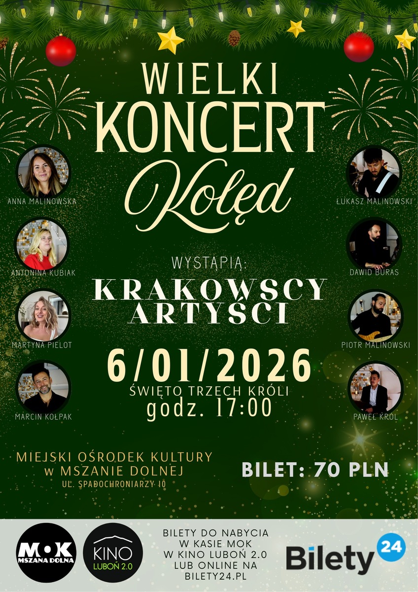 Zapraszamy serdecznie na wyjątkowy Wielki Koncert Kolęd, który rozgrzeje serca w chłodny, zimowy wieczór. Na scenie wystąpią Krakowscy Artyści, to zespół złożony z utalentowanych muzyków wokalistów i wokalistek, którzy przeniosą nas w świat dźwięków pełnych ciepła i blasku. Usłyszymy zarówno tradycyjne polskie kolędy, jak i nastrojowe pastorałki, podane w pięknych, współczesnych aranżacjach, nie zabraknie także świątecznych hitów znanych z radiowych list przebojów. W magicznej atmosferze świątecznych świateł, wśród dźwięków najpiękniejszych polskich kolęd i pastorałek, przeniesiemy się wspólnie do czasów, gdy święta miały smak dzieciństwa, a kolędy niosły pokój i nadzieję. Przyjdź, usiądź, posłuchaj – i zaśpiewaj razem z nami.*******