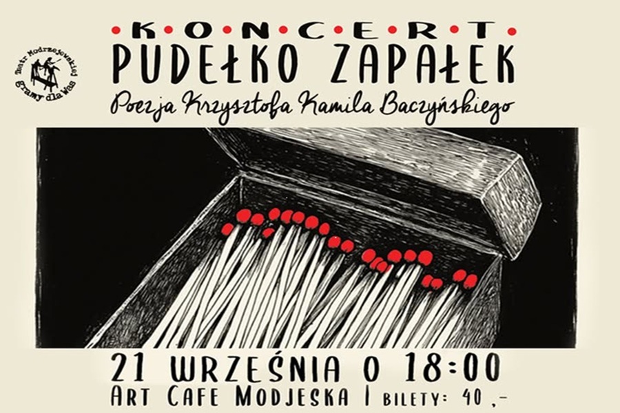 Koncert duetu Pudełko Zapałek to połączenie brzmienia głosu, saksofonu i gitary barytonowej i klasycznej. Oprócz autorskich tekstów głęboko osadzonych w rzeczywistości, zespół od lat komponuje muzykę do wierszy znanych poetów. Stąd między innymi pomysł przygotowania specjalnego cyklu koncertów, z których każdy jest w całości poświęcony innemu autorowi. W kwietniu 2023 roku muzycy występowali w Art Cafe Modjeska z koncertem „Edward Stachura – wszystko jest poezją”, śpiewając wiersze twórcy, od którego rozpoczęła się ich artystyczna działalność. We wrześniu 2023 roku przybliżyli publiczności świat wierszy Stanisława Grochowiaka, w grudniu przyszła kolej na Rafała Wojaczka, a w październiku 2024 – na Mirona Białoszewskiego. Tym razem zapraszają...