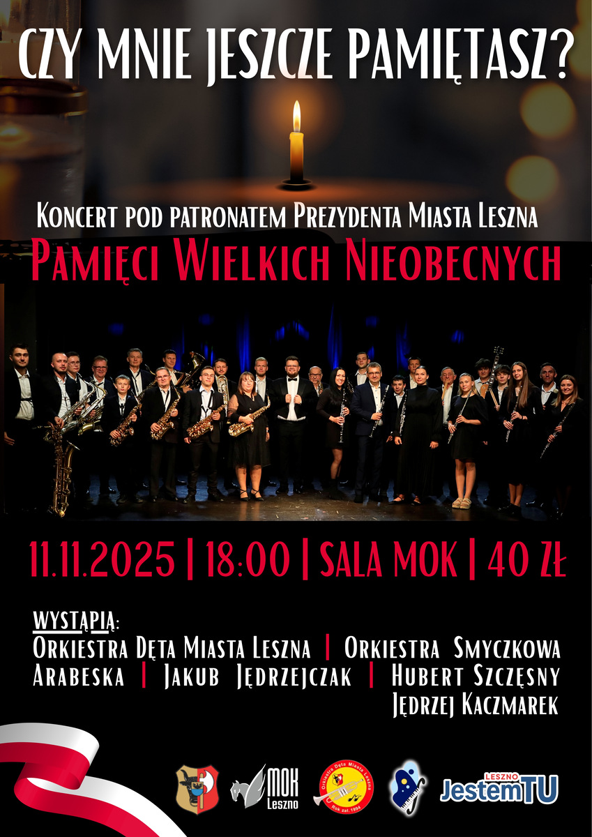 "Czy mnie jeszcze pamiętasz?" – koncert pamięci wybitnych artystów Zapraszamy na wyjątkowy koncert poświęcony pamięci nieżyjących legend polskiej sceny muzycznej – Zbigniewa Wodeckiego, Andrzeja Zauchy, Krzysztofa Krawczyka i innych. W programie koncertu usłyszymy najpiękniejsze utwory tych niezapomnianych artystów w nowych, poruszających aranżacjach. Na scenie wystąpią: Orkiestra Dęta Miasta Leszna, Orkiestra Smyczkowa z Państwowej Szkoły Muzycznej w Lesznie, Zespół Arabeska, a także soliści: Jakub Jędrzejczak, Hubert Szczęsny, Karolina Zygner i Jędrzej Kaczmarek. Miejski Ośrodek Kultury w Lesznie 11 listopada 2025 Wzruszająca muzyczna podróż, która na nowo przywoła wspomnienia i emocje – nie może Was zabraknąć!