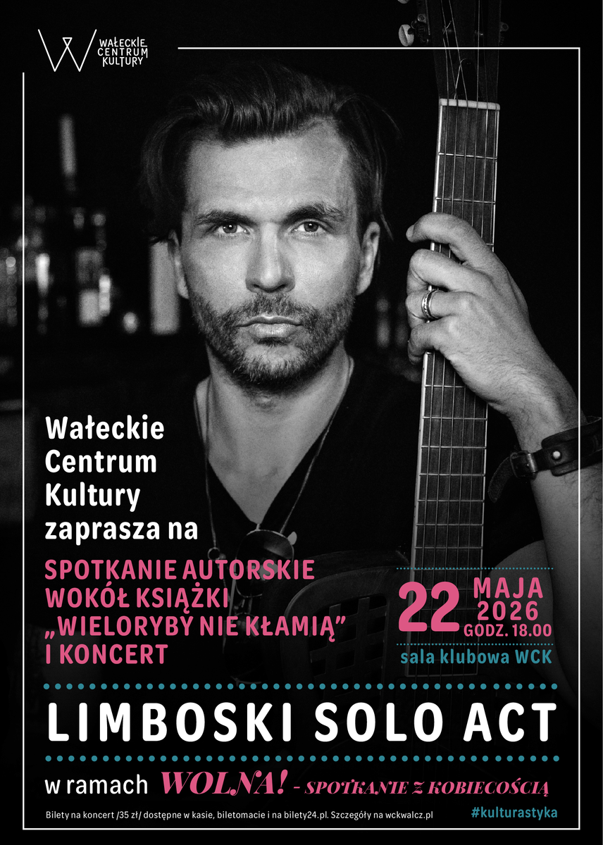 Wałeckie Centrum Kultury zaprasza na spotkanie autorskie wokół książki "Wieloryby nie kłamią" i solowy koncert Limboskiego, który odbędzie się w ramach majowej edycji wydarzenia Wolna! Spotkanie z kobiecością. 22 maja 2026, piątek, godz. 18.00, sala klubowa WCK LIMBOSKI SOLO ACTMichał Limboski – wokalista, gitarzysta i producent muzyczny. Nominowany do Fryderyków autor m.in. hitu „W trawie”. Posiada unikalny styl gitarowy, łączący wpływy surf rocka, jazzu i fingerstyle. Jego twórczość inspirowana jest bluesem i rock’n’rollem, ale także europejską tradycją piosenki literackiej. Lata 2020–2024 spędził w Berlinie, gdzie wykładał songwriting i gitarę na brytyjskiej uczelni muzycznej BIMM...
