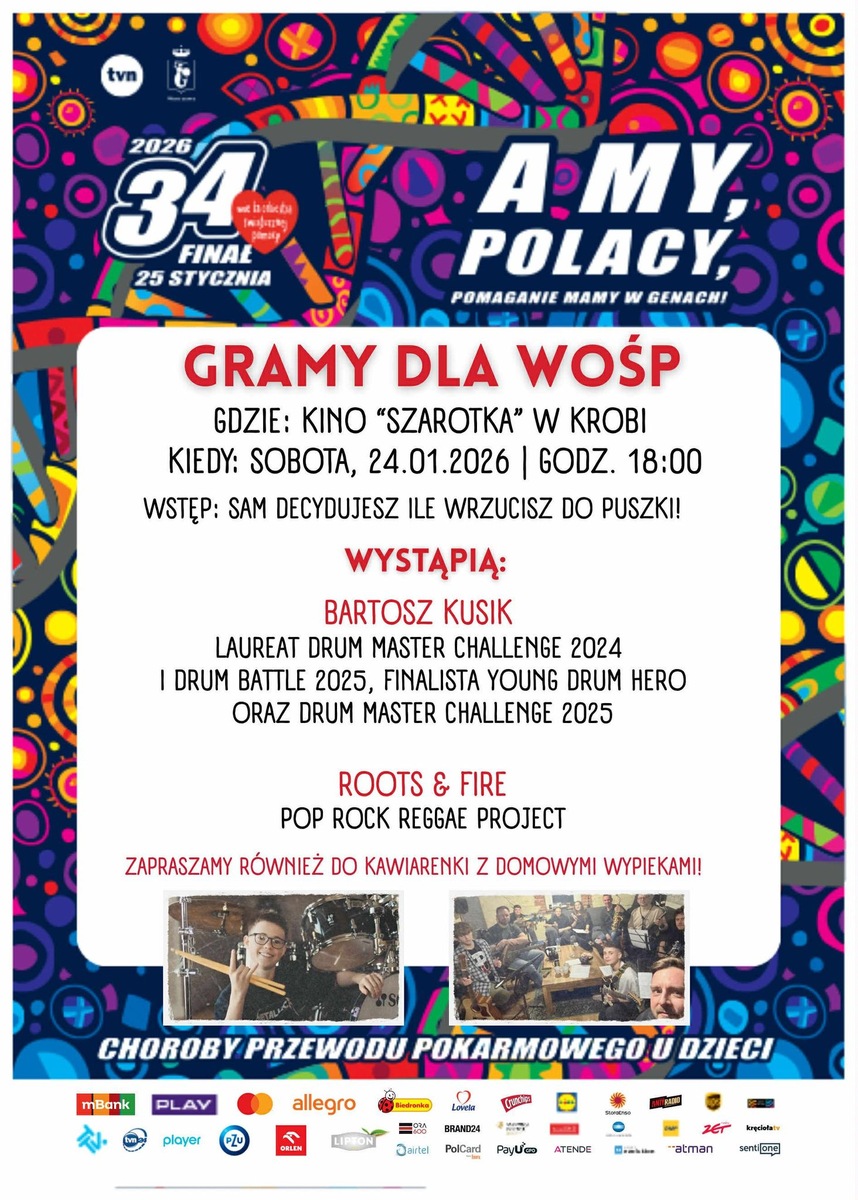 Już w sobotę 24 stycznia zagra największa orkiestra na świecie. Jej dźwięki usłyszeć będzie można w Krobi już w sobotę w ramach muzycznego wieczoru, na który serdecznie zapraszamy!Wystąpią: Bartosz Kusik 14 - letni, utalentowany młody perkusista z Leszna, którego rodzinne korzenie sięgają Krobi. Od najmłodszych lat konsekwentnie rozwija swoje umiejętności muzyczne, wykazując ponadprzeciętną wrażliwość artystyczną, pracowitość oraz sceniczną dojrzałość. Pierwszy kontakt z perkusją miał w wieku sześciu lat, natomiast regularną naukę gry rozpoczął dwa lata później. Od samego początku jego rozwój przebiegał niezwykle dynamicznie, co szybko znalazło odzwierciedlenie w pierwszych sukcesach scenicznych.Bartek kształci się w prywatnej szkole jazzu i muzyki rozrywkowej pod kierunkiem Jarosława Maćkowiaka – uznanego pedagoga i muzyka. Już we wczesnym etapie edukacji muzycznej występował na dużych i prestiżowych scenach, m.in. biorąc udział w wydarzeniu „Wielkie Granie2022” na Stadionie Narodowym w Warszawie, gdzie miał okazję zaprezentować swoje umiejętności przed szeroką publicznością.Rok 2024 przyniósł przełomowy sukces konkursowy – Bartosz zdobył I miejsce w ogólnopolskim konkursie Drum Master Challenge 2024 w kategorii do lat 12, potwierdzając swoją wyjątkową technikę, muzykalność oraz dojrzałość interpretacyjną. W kolejnych latach konsekwentnie umacniał swoją pozycję na polskiej i międzynarodowej scenie perkusyjnej.W 2025 roku Bartek został laureatem Drum Battle 2025, a także finalistą międzynarodowego konkursu perkusyjnego YOUNG DRUM HERO. W tym samym roku ponownie znalazł się w ścisłym finale prestiżowego konkursu Drum Master Challenge 2025, potwierdzając stabilny, wysoki poziom artystyczny. W czerwcu 2025 roku Bartosz wystąpił na największym polskim festiwalu rocka progresywnego w Toruniu, gdzie zaprezentował się u boku doświadczonych artystów, zdobywając uznanie publiczności i środowiska muzycznego.W październiku 2025 roku Bartek zaprezentował się na największych targach perkusyjnych UK DRUM SHOW w Liverpoolu jako jedyny reprezentant Polski, co stanowiło wyjątkowe wyróżnienie i potwierdzenie jego rosnącej pozycji na arenie międzynarodowej. Równolegle regularnie bierze udział w międzynarodowych warsztatach perkusyjnych, doskonaląc swoje umiejętności pod okiem uznanych artystów z różnych krajów.Obecnie Bartosz należy do grona czterech najlepszych perkusistów w Polsce w grupie wiekowej od 12 do 17 lat, co stanowi wyjątkowe osiągnięcie na skalę krajową. Kolejnym ważnym etapem w jego karierze będzie rok 2026, w którym Bartek zagra na ART ROCK FESTIVAL w Niemczech – prestiżowym międzynarodowym wydarzeniu muzycznym, będącym znaczącym krokiem w rozwoju jego kariery artystycznej.Dotychczasowe osiągnięcia Bartosza jednoznacznie potwierdzają jego wyjątkowy talent, determinację oraz konsekwencję w dążeniu do doskonałości artystycznej, czyniąc go jednym z najbardziej obiecujących młodych perkusistów swojego pokolenia. Roots & Fire to energetyczna formacja łącząca reggae, rock i blues w jedno, pulsujące brzmienie. Zespół napędzają cztery wyraziste wokalistki, wspierane przez sekcję dętą i solidną sekcję rytmiczną, które razem tworzą pełne groove’u, koncertowe show. Muzyka Roots & Fire czerpie z klasycznych korzeni, ale żyje tu i teraz – jest dynamiczna, szczera i nastawiona na kontakt z publicznością. Na scenie to ogień, wspólnota i granie z serca, dokładnie w duchu WOŚP.