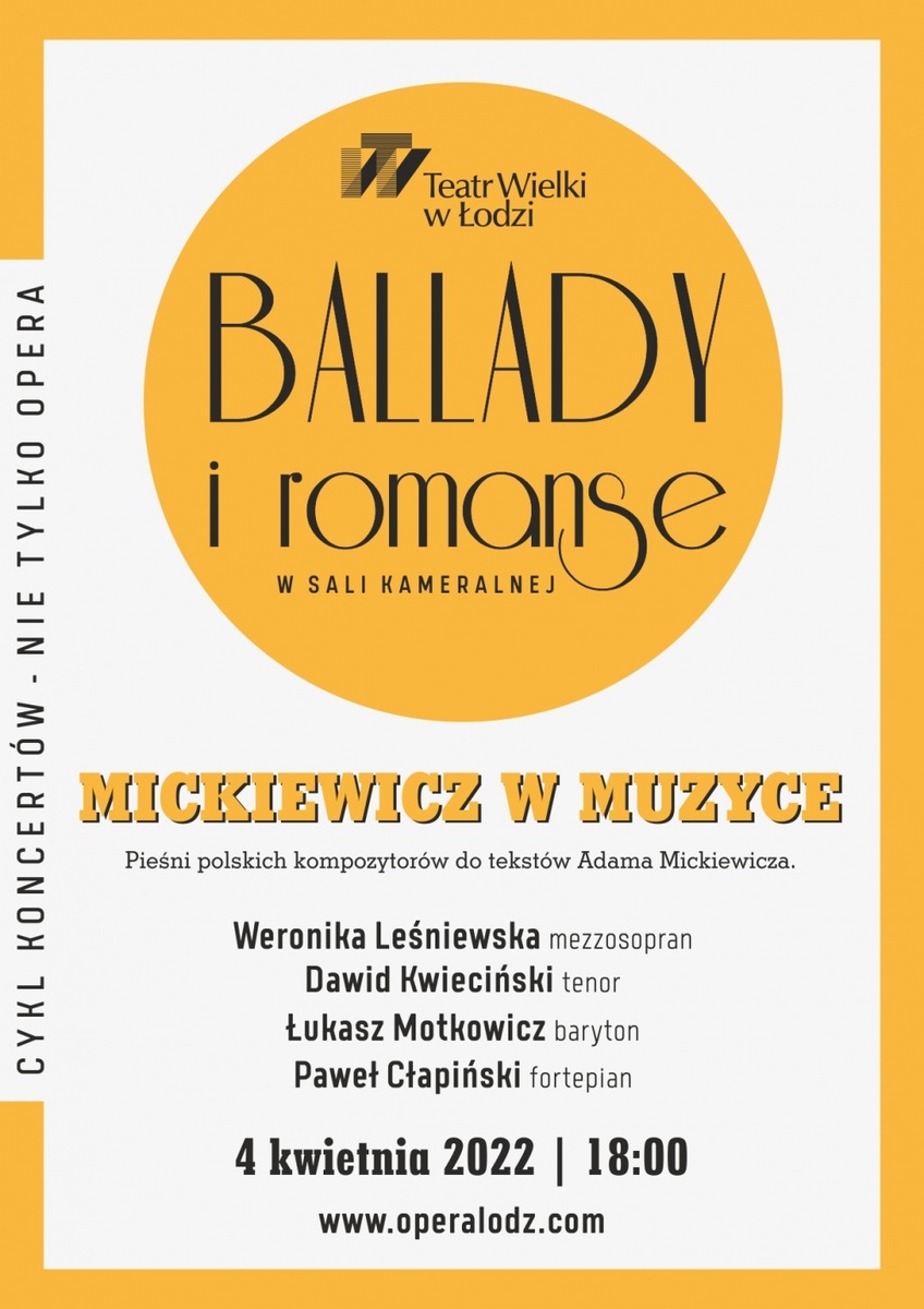 BALLADY I ROMANSE na Scenie Kameralnej z cyklu NIE TYLKO OPERA MICKIEWICZ W MUZYCE 4 kwietnia 2022 | godz. 18.00 Muzyka łagodzi obyczaje - mówił Jerzy Waldorff – legenda polskiego życia muzycznego, a przez to, że towarzyszy nam, na co dzień, nie zastanawiamy się czy i jaki ma nas wpływ – a z pewnością ma! Swymi dźwiękami potrafi nas zaskoczyć, wprawić w dobry nastrój, pozwala zapomnieć o tym, czego pamiętać nie chcemy, wywołać szczery uśmiech, choć i łzy wzruszenia również zdarzają się towarzyszyć jej dźwiękom. Są bowiem artyści – wykonawcy muzyki i jej interpretatorzy – którzy swoją wrażliwością i talentem potrafią nadać muzyce to „coś”, bez czego byłaby tylko zwykłym zapisem nutowym. Tym razem na Scenie Kameralnej Mickiewicz w muzyce… Wspaniali...