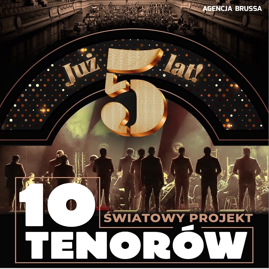 Piątka dziesiątki? A może dziesiątka na piątkę? Oto 10 tenorów obchodzi pięciolecie swoich tras koncertowych po całej Polsce. Od ponad pięciu lat formacja 10 tenorów w międzynarodowej obsadzie zachwyca polską publiczność koncertami, z których każdy ma niepowtarzalną magię. Ten sukces podsumowuje jubileuszowa trasa koncertowa. Pierwsza część koncertu porywa w Świat klasyki w pieśniach Cool Portera" Cest Magnifique" czy fragmencie opery Rigoletto Giuseppe Verdiego "La donna e mobile". Tenorzy odwiedzają międzywojenną Warszawę przypominając wielki przebój Jerzego Petersburskiego " Ta ostatnia niedziela " by później wspólnie z publicznością zaśpiewać takie przeboje jak "Diana" Pola Anki czy " Celito Lindo" Quiurino Mendozy y Corteza....
