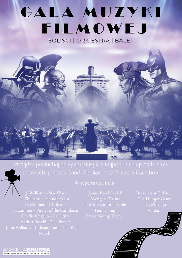 Muzyka i film... Kiedy wspominamy nasze ulubione filmy, widzimy w pamięci sceny z udziałem aktorów, a w uszach brzmi nam temat przewodni ścieżki dźwiękowej, melodia z czołówki albo muzyczna ilustracja danego fragmentu. Nie sposób myśleć o „Gwiezdnych wojnach", „Liście Schindlera" czy „Doktorze Żywago" i nie słyszeć w wyobraźni muzyki, która zrosła się z tymi obrazami jak nuty z pięciolinią... A przecież są jeszcze tak wspaniałe filmy jak „West Side Story" czy „Upiór w operze", w których kompozycje mistrzów musicalu są sednem całości: Leonard Bernstein i Andrew Lloyd Webber to twórcy przebojów wszech czasów. No i wreszcie – czy w ogóle jest ktoś na sali, kto nie pamięta motywów muzycznych z filmów o Jamesie Bondzie oraz Indianie Jonesie?! Mają zatem Państwo niepowtarzalną okazję, aby tego wieczoru ożywić swoje filmowo-muzyczne wzruszenia podczas naszego koncertu. Porządku pilnować będzie żandarm z Saint-Tropez – on też się pojawi wśród nas, oczywiście w postaci dźwiękowej.