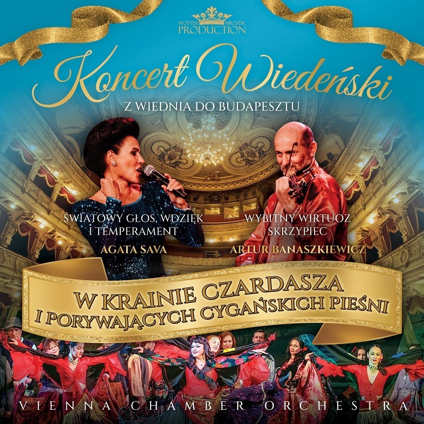 Wykonawcy zabiorą Państwa w niecodzienna, czarującą muzyczna podróż, która rozpocznie się w Starym Wiedniu, stopniowo odkrywając fascynacje mistrzów takich jak Strauss, Lehar, Kalman, folklorem Romskim, by w drugiej części koncertu porwać słuchaczy wraz z taborem cygańskim do różnych krajów i kultur Europy (m. in. Austria, Polska, Węgry, Rumunia, Bałkany, Hiszpania, Włochy). Prawdziwą atrakcją będę wirtuozowskie, niezwykle efektowne, przyjmowane entuzjastycznie na całym świecie, skrzypcowe parafrazy i fantazje Artura Banaszkiewicza w autorskim wykonaniu oraz światowy unikatowy glos, wielki sceniczny urok i ognisty temperament divy operowej Agaty Savy - mezzosopran. A także popisowy, brawurowy taniec solistów baletu. Artyści...