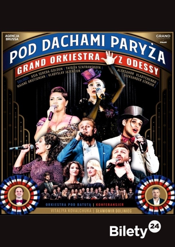 POD DACHAMI PARYŻA Piękna muzyka, wspaniali artyści - po prostu Pod Dachami Paryża - Grand Orkiestra z Odessy! Paryż... Od stu lat oczy (i uszy) świata są zwrócone na piosenkę francuską, która się urodziła pod dachami Paryża, na Polach Elizejskich, pod Wieżą Eiffla, w Lasku Bulońskim i przy szklanej piramidzie przed Luwrem. To muzyka znaczona takimi nazwiskami jak Edith Piaf, Joe Dassin, Dalida, Mireille Mathieu. To kankan, kabarety (na czele z "Moulin Rouge"!), a nawet upiór - bo przecież to właśnie w gmachu opery paryskiej straszył bohater powieści i musicalu. Co do musicali - najsłynniejszy dzwonnik z katedry Notre Dame nadal pojawia się na scenach muzycznych całego świata. Zapraszamy na dwugodzinne spotkanie z muzyką francuską, dające...