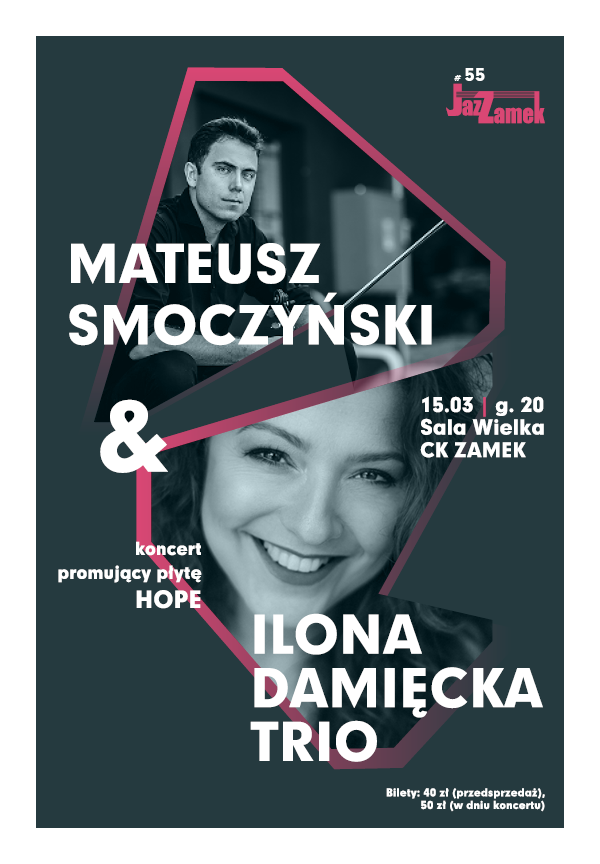 MATEUSZ SMOCZYŃSKI I ILONA DAMIĘCKA TRIO ZAPRASZAJĄ NA KONCERT PROMUJĄCY PŁYTĘ „ HOPE". 15.03 g. 20 Sala Wielka Bilety 40 zł przedsprzedaż, 50 zł w dniu koncertu TRIO ILONY DAMIĘCKIEJ I GOŚĆ SPECJALNY ‒ MATEUSZ SMOCZYŃSKI ZAGRAJĄ MUZYKĘ Z OSTATNIEJ PŁYTY ARTYSTKI ‒ „HOPE” Album „Hope” wypełnia muzyka ilustracyjna. Począwszy od pierwszego utworu „The Sea”, a kończąc na wokalnym „Ten Four” album przepełniony jest w większości minimalizmem i subtelnym ciepłym brzmieniem. ILONA DAMIĘCKA ‒ polska pianistka jazzowa, wokalistka i kompozytorka. Absolwentka Wydziału Jazzu i Muzyki Rozrywkowej w Katowicach. Ilona Damięcka jest bardzo wszechstronną artystką, która zarówno jako pianistka i wokalistka porusza...