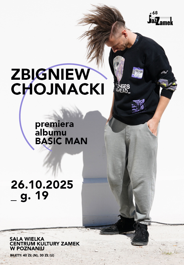 26.10.2025 JAZZAMEK #68 g. 19 | Koncert: Zbigniew Chojnacki – premiera albumu „Basic Man” Sala Wielka / bilety: 40 zł (n) / 30 zł (u) Koncert z miejscami siedzącymi nienumerowanymi bilety dostępne online i w Kasie CK ZAMEK W październiku zapraszamy na kolejną odsłonę cyklu „JazZamek” – koncert Zbigniewa Chojnackiego promujący nowy album „Basic Man”. Siedem piosenek tworzy spójną opowieść o nieoczekiwanym świecie. Jeśli chcesz przeżyć przygodę, która Cię odmieni; potrzebujesz się otworzyć i niczego nie oczekiwać, ten koncert jest dla Ciebie. To będzie prawdziwa przygoda! Zbigniew Chojnacki – akordeonista, elektronik, improwizator, który potrafi komponować. Z akordeonem i mnóstwem żywej elektroniki jest gotowy na muzyczne ryzyko bez koła ratunkowego....