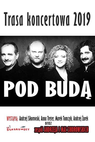 40-LECIE ZESPOŁU POD BUDĄ Znakomite połączenie 2 niepowtarzalnych projektów w 1 koncercie! Jubileusz 40 - lecia Zespołu Pod Budą, oraz wyjątkowa muzyka Zespołu Andrzeja i Maji Sikorowskich. Wystąpią: Zespół POD BUDĄ: Andrzej Sikorowski – śpiew, gitara, mandolina, prowadzenie koncertu Anna Treter- śpiew, instrumenty klawiszowe Marek Tomczyk- gitary Andrzej Żurek- gitara basowa Zespół Andrzeja i Mai Sikorowskich: Andrzej Sikorowski - gitara, śpiew, prowadzenie koncertu Maja Sikorowska – śpiew Gertruda Szymańska – perkusja Jacek Królik – gitary Tomasz Kupiec– kontrabas POD BUDĄ: Zespół wyłonił się w 1977 roku z krakowskiego kabaretu studenckiego o tej samej nazwie. Do dzisiaj dał kilka tysięcy koncertów w kraju i zagranicą (USA, Kanada,...