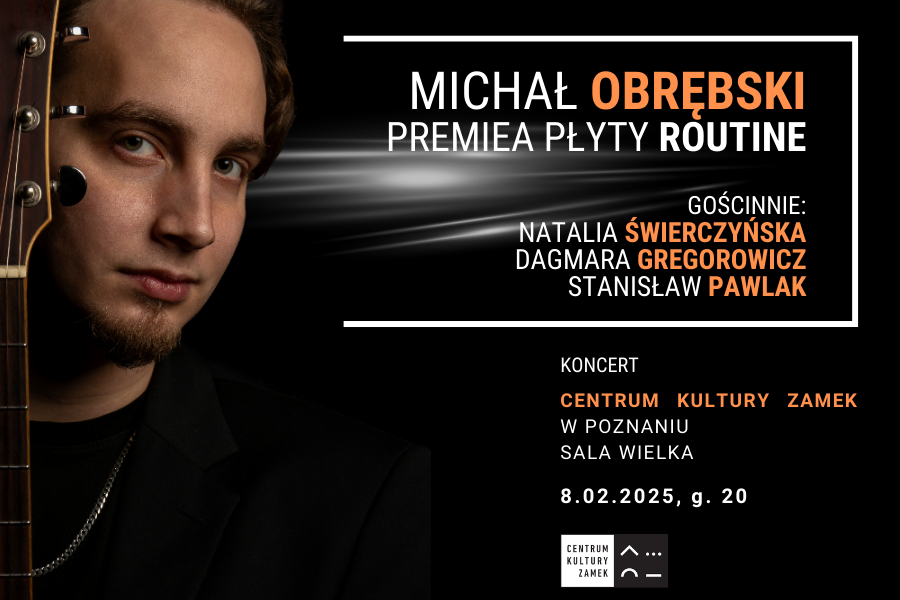 Michał Obrębski – premiera płyty Routine Sala Wielka | koncert g. 20 bilety: 40 zł, 60 zł, 80 zł – 3 pule cenowe I pula „early birds” 40 zł (do 4.01) II pula 60 zł (5.01-1.02) III pula 80 zł (2.02-8.02) Zapraszamy na niezwykły koncert Michała Obrębskiego, który zagości w Centrum Kultury Zamek w Poznaniu w ramach trasy promującej najnowsze wydawnictwo – album Routine. To wyjątkowa okazja, by doświadczyć muzycznej podróży przez różnorodne gatunki i emocje. Michał Obrębski – gitarzysta, kompozytor i producent muzyczny – słynie z łączenia progresywnego rocka, ambientu, flamenco i jazzu w unikalną symfonię dźwięków. Jego akustyczna gitara, wzbogacona elektronicznymi efektami, tworzy magiczną przestrzeń muzyczną, która zachwyca nawet najbardziej...