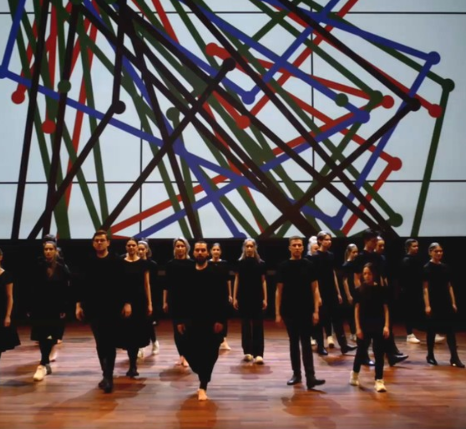 Fotografia z wydarzenia „Dźwięk/Ciało/Akcja” Grupa Tancerzy na scenie CK ZAMEK. W tle kolorowa wizualizacja.