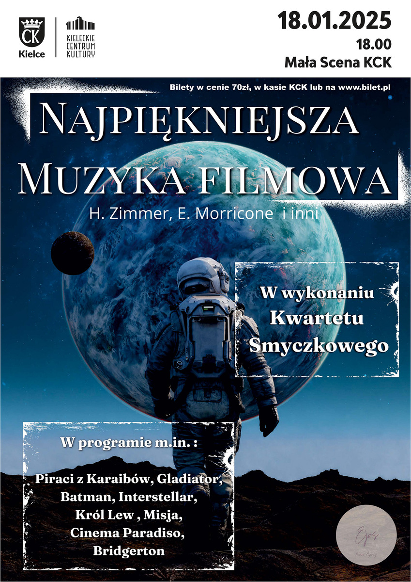 KONCERT MUZYKI FILMOWEJ W repertuarze koncertu znajdą się utwory z tych bardziej i mniej znanych filmów, które zapewnią widzom niezapomniane chwile i przeniosą ich do magicznego świata kina. 75 minut filmowej muzyki! Koncert ten to idealna propozycja zarówno dla miłośników muzyki filmowej, jak i rodzin z dziećmi oraz osób szukających niebanalnych wrażeń kulturalnych. KWARTET SMYCZKOWY „EJOS” Absolwenci prestiżowych uczelni muzycznych w Warszawie, Londynie, Berlinie i Poznaniu. Doświadczeni instrumentaliści. Mają za sobą występy z Filharmonią Dowcipu Waldemara Malickiego, Ewą Urygą, Edytą Górniak oraz innymi gwiazdami polskiej sceny muzycznej. Realizowali również projekty dla platformy Netflix oraz dla światowej sławy Candlelight Concerts.*******