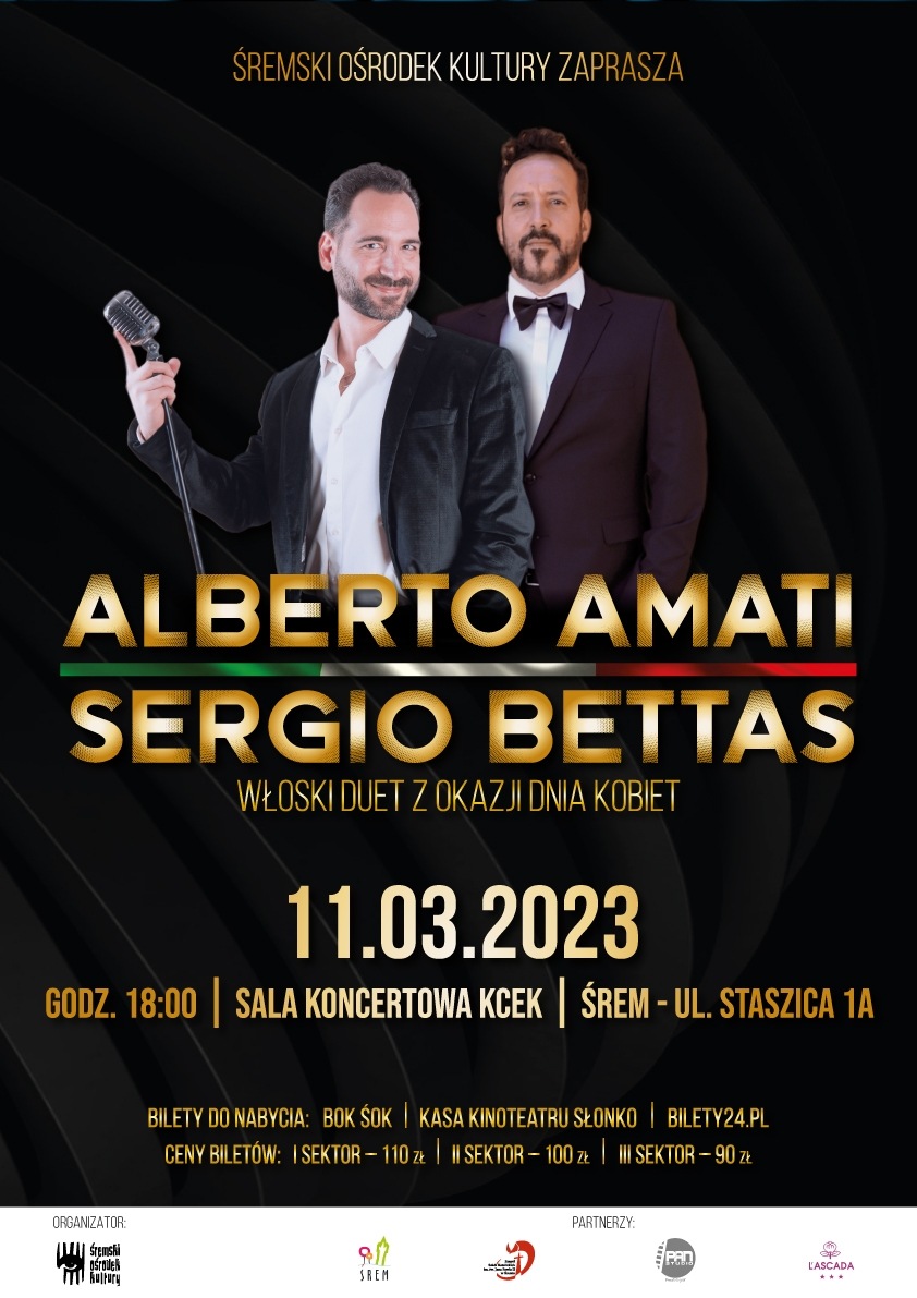 W ciągu ostatnich lat Aberto Amati zagrał kilkaset koncertów w kilkudziesięciu miastach w całej Polsce. Znany jest również śremksiej publiczniości. Sergio Bettas - włoski tenor pochodzący z Ferrary. Absolwent Muzycznego Konserwatorium w rodzinnym mieście. Muzyka od zawsze wypełniała jego życie. Zaczynał od gry na instrumentach. Pasję do śpiewu odkrył w sobie nieco później. Jego artystyczna droga związana jest z Teatrem Teatro Regio (Parma) oraz Teatrem Wielkim (Warszawa). Debiutował w roli Manrika w "Trubadurze" Verdiego w 2006 roku. W swoim repertuarze posiada zarówno klasyczne kompozycje operowe, jak i utwory muzyki rozrywkowej. Wokaliści mają w swoim repertuarze nie tylko największe włoskie przeboje, ale również wiele utworów Franka Sinatry...