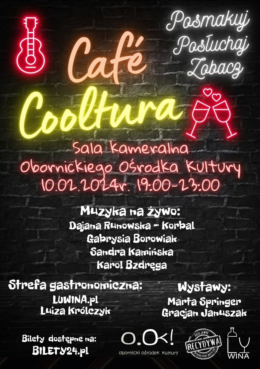 Cafe Cooltura to okazja, aby się spotkać, porozmawiać, wypić kieliszek wina i posłuchać muzyki. W przearanżowanej sali kameralnej OOK, przy stolikach wśród świec posłuchamy muzyków ze środowiska obornickiego i nie tylko!