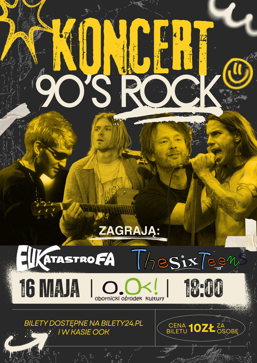 Koncert: 90’s Rock Zapraszamy na wyjątkowy koncert inspirowany klimatem lat 90., podczas którego na scenie zaprezentują się dwa zespoły powstałe w wyniku muzycznych przesłuchań organizowanych w Obornickim Ośrodku Kultury przez Jeremiasza Bauma - to właśnie on czuwa nad całością projektu. EUkatastrofa oraz TheSixteens to zespoły stworzone przez młodych muzyków, którzy połączyli siły, by oddać energię i charakter rocka lat 90. Czeka Was wieczór pełen gitarowego brzmienia, nostalgii i świeżej energii młodej sceny muzycznej. Data: 16 maja Godzina: 18:00 Miejsce: Obornicki Ośrodek Kultury (OOK) Sala Kameralna Bilety: 10 zł / osoba (dostępne online oraz w kasie OOK) Dołączcie do nas i poczujcie ducha rocka lat 90. na żywo!*******