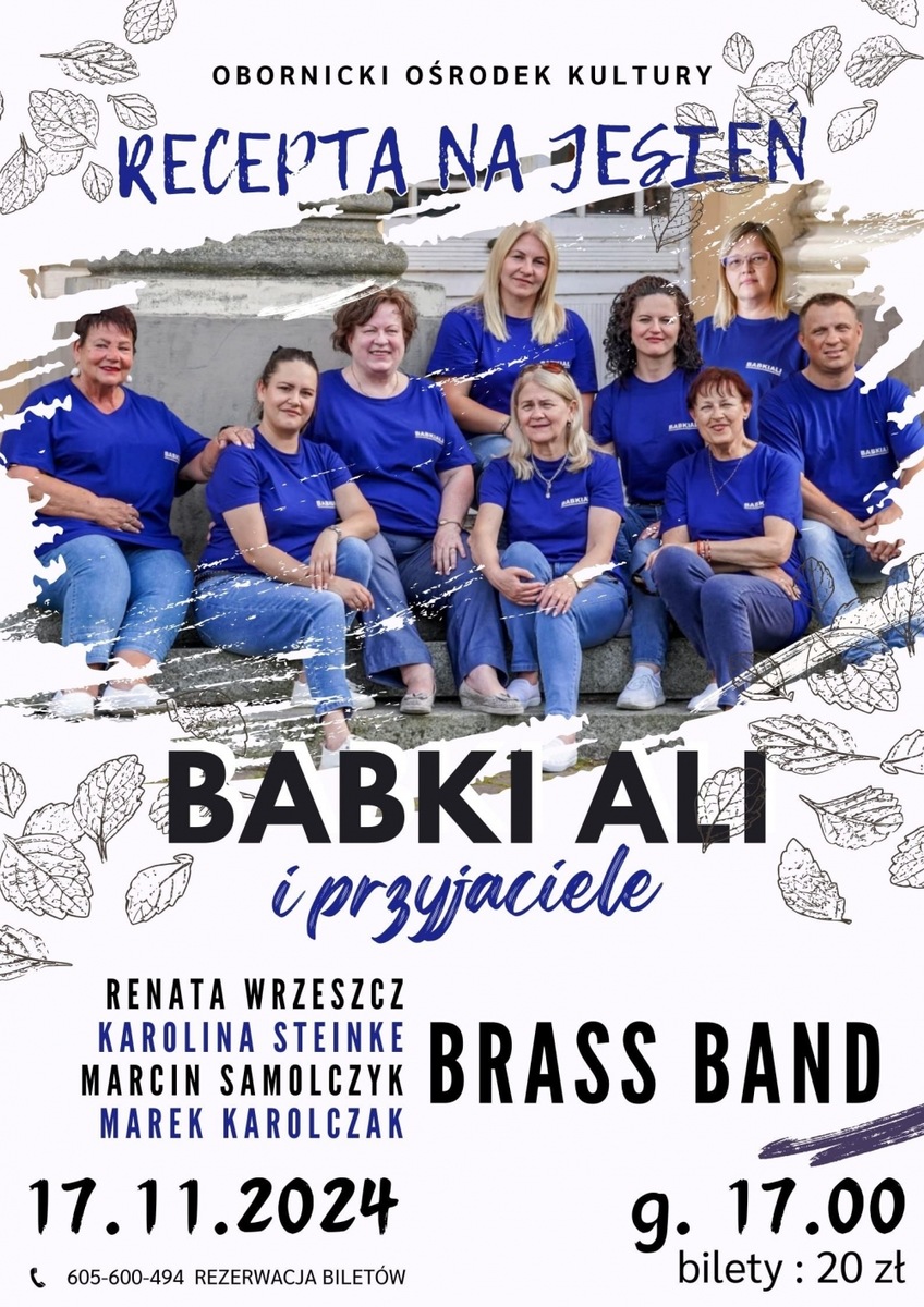 "Recepta na jesień" to koncert pogodny. Taki, któy ma roświetlić jesienną szarzyznę. Honory gospodarza czynić będzie zespół BABKI ALI. A w programie wystapią także Brass Band Oborniki, Karolina Steinke, Renata Wrzeszcz i Marcin Samolczyk.