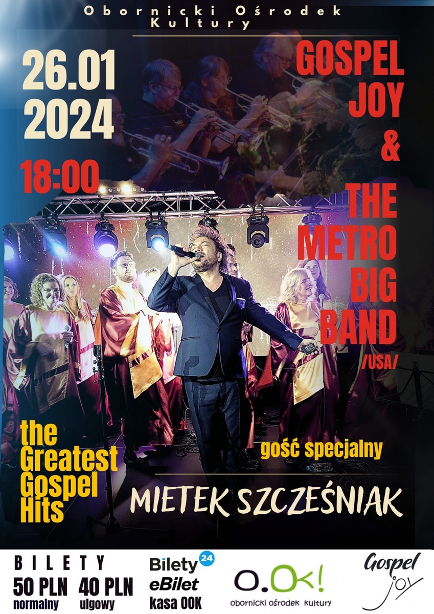 Gospel Joy - to poznański chór, przepełniony energią i radością, na scenie od 25 lat. Żywiołowy śpiew w połączeniu z dynamiczną choreografią i barwnymi strojami sprawia to ich znak rozpoznawczy. W koncercie towarzyszy im amerykański The Metro Big band.Gościem specjalnym będzie Mietek Szcześniak. Cena biletów 50 zł. Bilety ulgowe w cenie 40 zł przeznaczone są dla posiadaczy karty Rodzina 3+ oraz Obornickiej Karty Seniora. Bilety dostępne także w Obornickim Ośrodku Kultury.*******