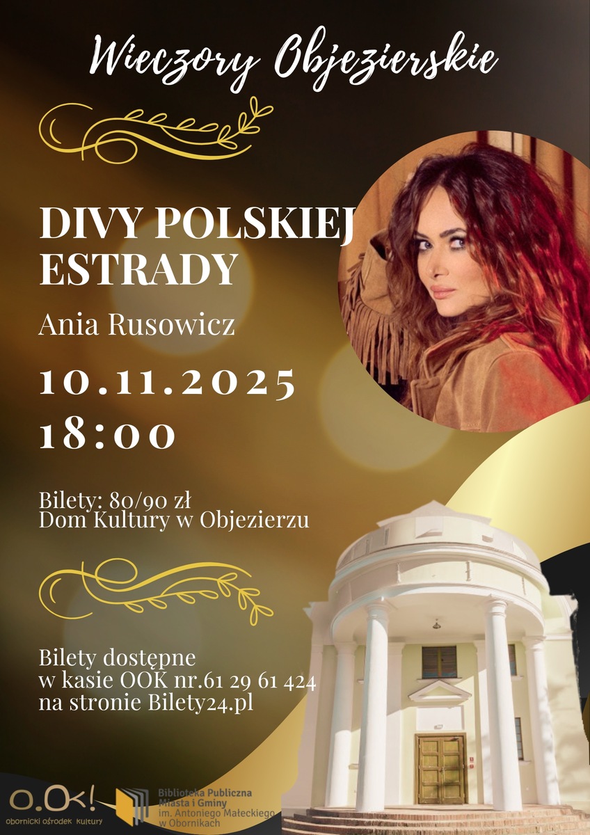 W ramach cyklu „Wieczory Objezierskie” zapraszamy na niezwykły koncert Anny Rusowicz, która zabierze nas w muzyczną podróż śladami największych div polskiej estrady. Usłyszymy ponadczasowe przeboje, które na trwałe wpisały się w historię polskiej muzyki rozrywkowej – w nowych, wyjątkowych interpretacjach.*******
