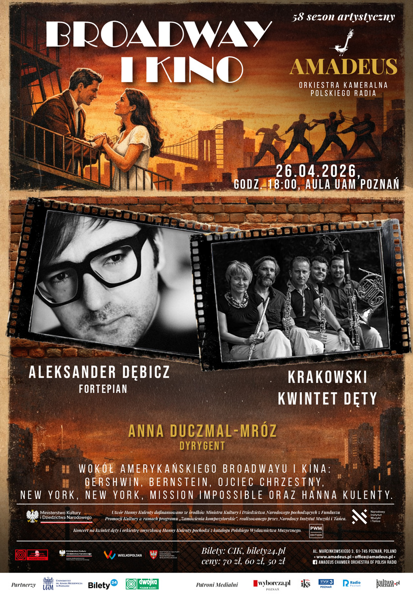 Broadway i kino – muzyczna podróż od Nowego Jorku po Hollywood 26 kwietnia 2026 roku o godz. 18:00 w Auli Uniwersytetu im. Adama Mickiewicza w Poznaniu Orkiestra Kameralna Polskiego Radia Amadeus zaprasza Was na wyjątkowy wieczór pełen energii, emocji i filmowych wspomnień. Koncert „Broadway i kino” będzie przedostatnim spotkaniem z orkiestrą przed przerwą wakacyjną. Tego wieczoru scena zamieni się w muzyczny most łączący nowojorski Broadway z wielkim ekranem kina. W programie znajdą się zarówno dzieła inspirowane amerykańską kulturą muzyczną, jak i słynne tematy filmowe, które od lat rozpalają wyobraźnię publiczności na całym świecie. Gościem specjalnym koncertu będzie znakomity pianista Aleksander Dębicz – artysta o niezwykłej wrażliwości...