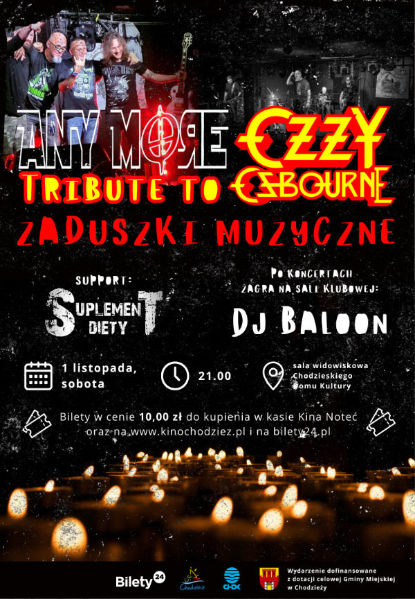 Zapraszamy, jak co roku w okresie listopada na Zaduszki Muzyczne! Tym razem spotkamy się 1 listopada z zespołem „ANY MORE” w koncercie upamiętniającym twórczość Ozziego Osbourne’a! Any More powstał na początku lat 90-tych w Bydgoszczy. Nagrał demo w studio Tomasz Łosowskiego (Kombi) utrzymując swoją twórczość w stylistyce heavy rocka. W pierwotnym składzie przetrwał kilka lat i zawiesił działalność koncertową. Po wielu zmianach m.in. składu i koncepcji wykrystalizował się jako kwartet grający utwory z repertuaru Ozzy Osbourne’a, który odszedł dosłownie przed chwilą, więc warto podkreślić i upamiętnić jego twórczość na tegorocznych Zaduszkach Muzycznych w ChDK! Grupa Any More przygotowała program koncertowy „Just say OZZY!”, który stanowi set...