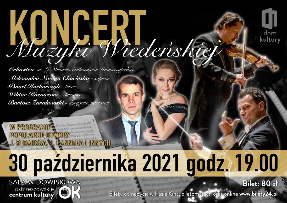 Spieszymy do Państwa z radosną informacją, że już 30 października odbędzie się XVIII Koncert Muzyki Wiedeńskiej. Wystąpi dla Państwa Orkiestra im. J. Straussa Filharmonii Uniwersyteckiej oraz Aleksandra Novina Chacińska- sopran, Paweł Kucharczyk - tenor, Wiktor Kuzniecow – skrzypce, Bartosz Żurakowski - dyrygent, narrator. W programie popularne utwory J. Straussa, J. Lannera i innych. Pomimo, że jest to kolejny już koncert, zainteresowanie tym wydarzeniem nie słabnie, a grono miłośników Straussa, Lehara czy Kalmana wciąż się powiększa. Jako organizatorzy tego wydarzenia cieszymy się, że zyskał on sympatię renomę nie tylko w środowisku lokalnym. Koncert od wielu już lat jest jednym z najważniejszych wydarzeń kulturalnych w Ostrzeszowie, w którym...
