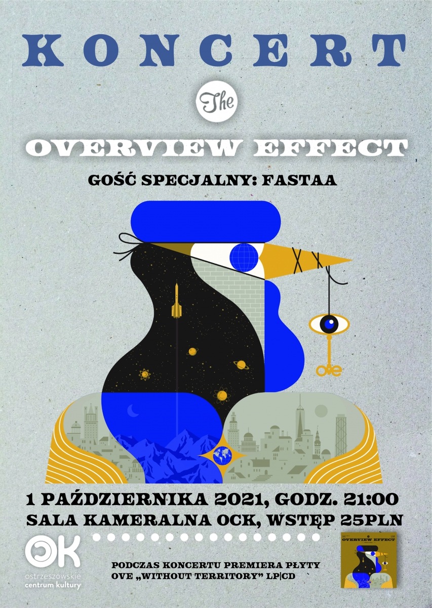 OvE (The Overview Effect) to zespół, który tworzą muzycy z Ostrzeszowa i okolic, znani z grania m.in. w formacjach Vermona Kids, Let The Boy Decide, Blue Raincoat, Lutownica, Last Train Is The Slowest czy Low-Cut. Na swojej pierwszej płycie Without territory, która ukaże się wiosną 2021 nakładem Fonoradar Records, raczą nas soczystą fuzją soulu, jazzu, afrobeatu i pewnie innych nurtów, które nie mają jeszcze nazwy. Rytmiczna energia, gitarowe i klawiszowe przestrzenie splatająsię ze śpiewem sekcji dętej, tworząc oryginalną muzyczną mieszankę, w której taneczna dynamika walczy o lepsze z balladowym ciepłem. OvE swymi piosenkami bez słów przenosi nas na wyimaginowane terytoria pieśni i rytmu, wzruszenia i ekscytacji.OvE to Jacek Świłło (alt sax), Adam Jarosik (tenor sax), Łukasz Hoja (instr. klawiszowe), Michał Jamroży (gitara), Krzysztof Szymasek (git. Basowa), Krystian Pilarczyk (perkusja) i Dawid Bąk (perkusjonalia), Norbert Wardawy (trąbka), Tomasz Zatorski (perkusjonalia)
