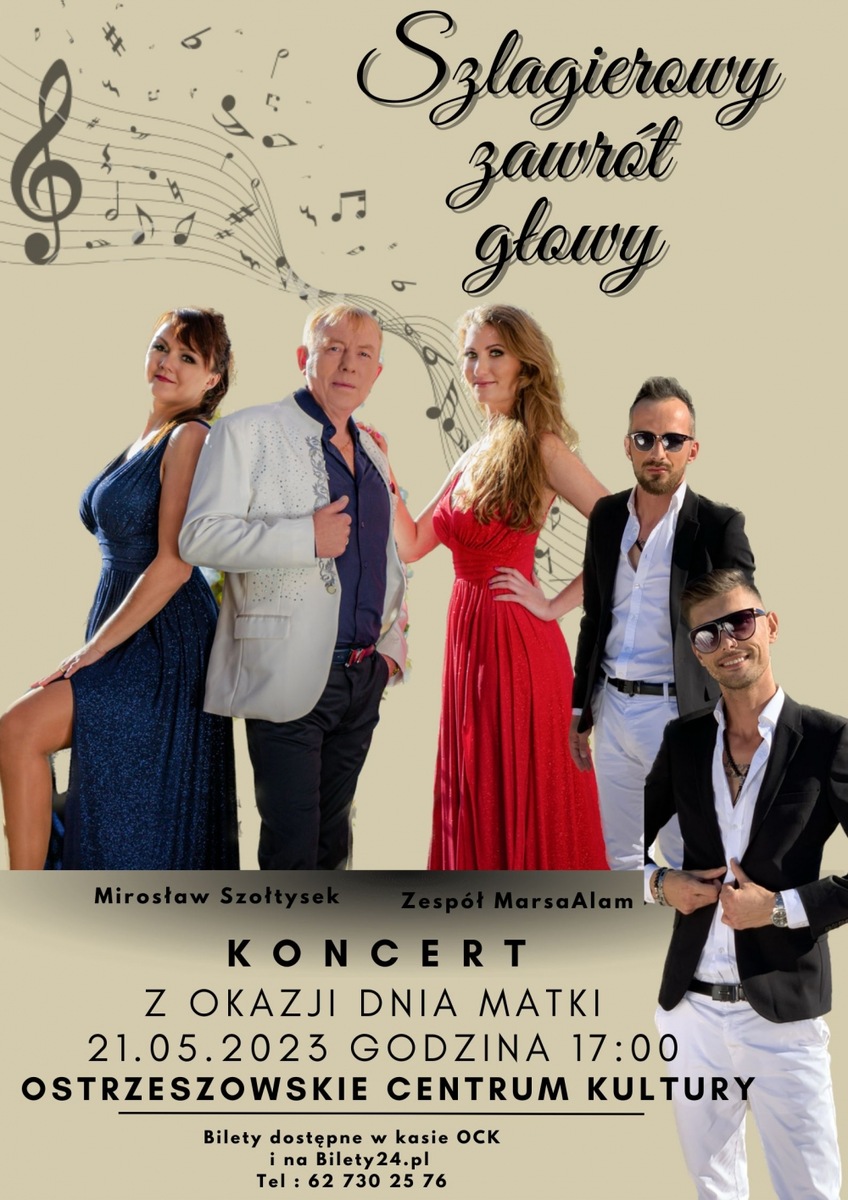 Szlagierowy zawrót głowy z okazji Dnia Mamy:) W 120 minutowym show wystąpią dla Państwa: Mirosław Szołtysek- prawdziwa legenda śląskich szlagierów. Ślązak z krwi i kości, laureat nagród Hanysy, śląska perła Telewizji TVS, a także osobowość Roku Miasta Chorzów. Uczestnik Letniej Trasy Dwójki TVP. Wokalista i tekściarz. MarsaAlam- profesjonalny duet dwóch młodych i energicznych muzyków, wyróżniających się klasą oraz oryginalnością. W roku 2023 wydają swoją drugą autorską płytę. Na rynku muzycznym od 7 lat. Ostatnia piosenka zespołu „Mój magiczny świat” przyniosła ich spory sukces. Utwór w szybkim tempie podbija stacje radiowe i telewizyjne. Wszystkie utwory melodyjne i szybko wpadające w ucho. Mają na swoim koncie wiele koncertów. Myślą...